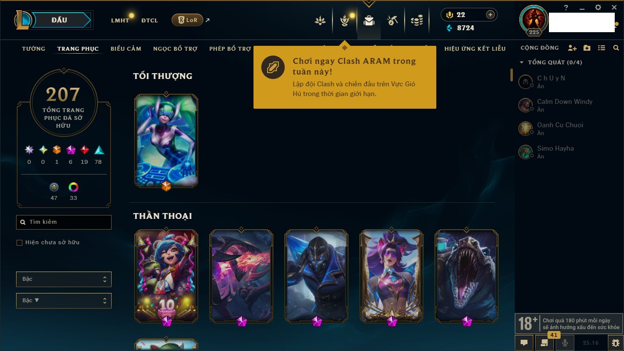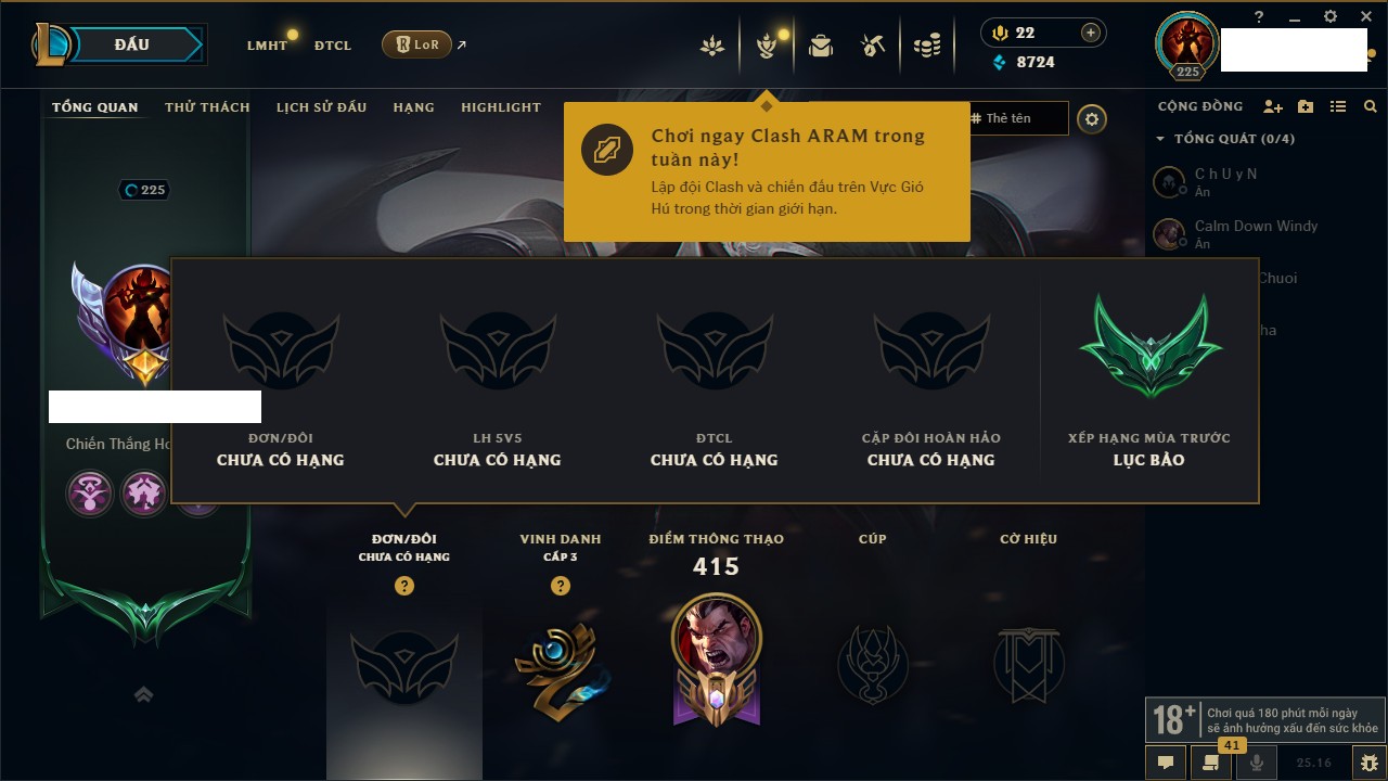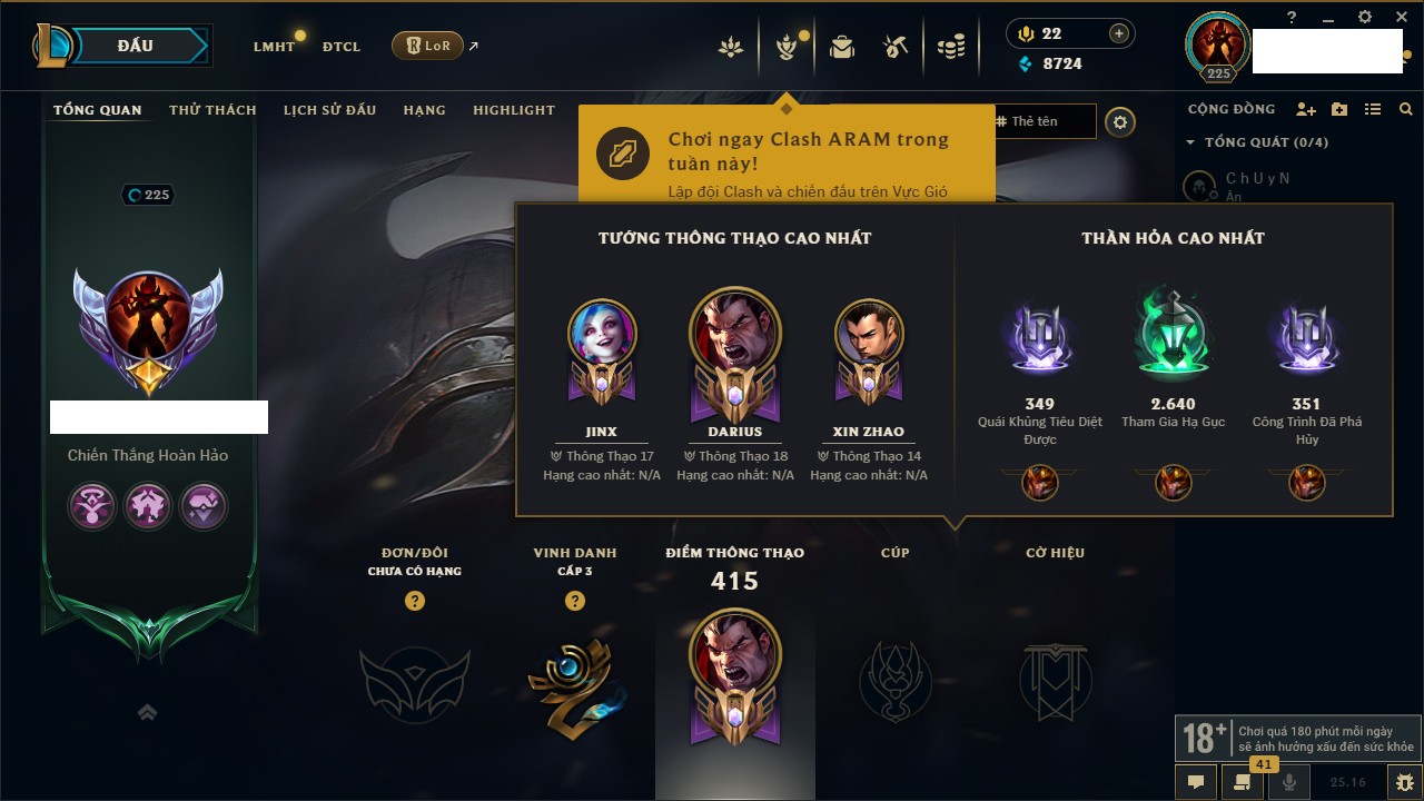 Rank Đơn: Vàng IIKhung: VàngTướng: 171 - Còn 219803 THXTrang Phục: 254Rank ĐTCL: Chưa RankLinh Thú: 78