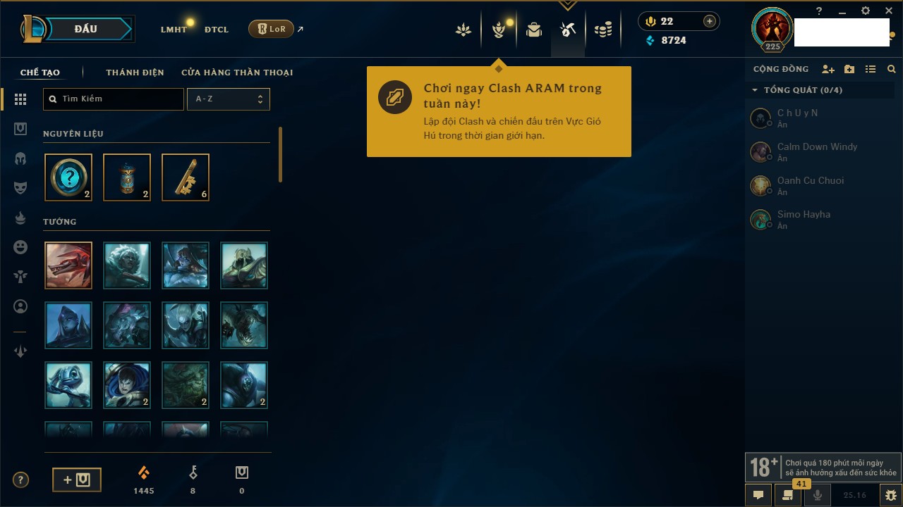 Rank Đơn: Vàng IIIKhung: VàngTướng: 171 - Còn 212486 THXTrang Phục: 201Rank ĐTCL: Bạc ILinh Thú: 79