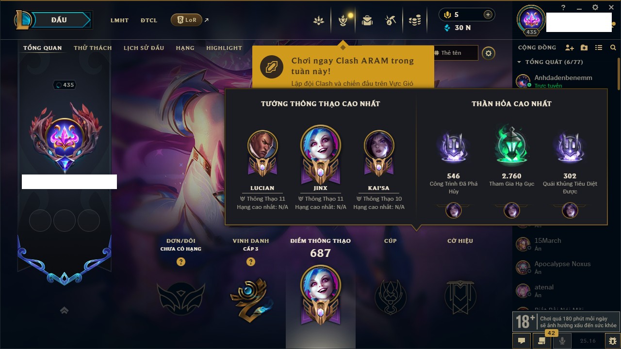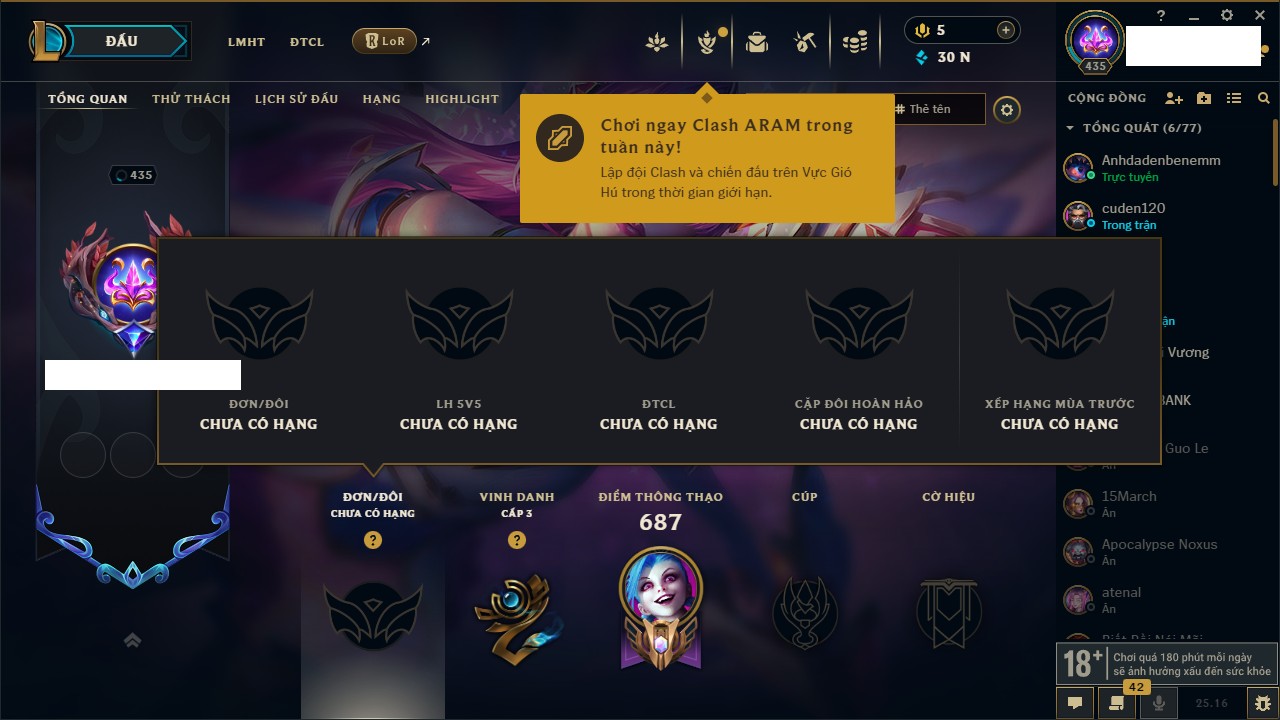 Rank Đơn: Vàng IKhung: BạcTướng: 171 - Còn 60584 THXTrang Phục: 286Rank ĐTCL: Vàng IIILinh Thú: 117