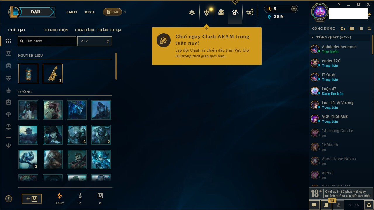 Rank Đơn: Vàng IVKhung: VàngTướng: 171 - Còn 660284 THXTrang Phục: 199Rank ĐTCL: Chưa RankLinh Thú: 34