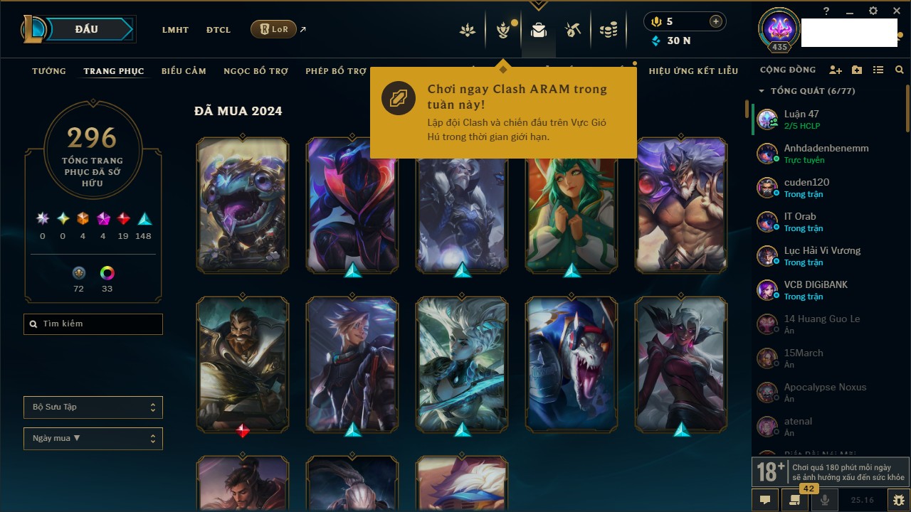 Rank Đơn: Vàng IIIKhung: VàngTướng: 171 - Còn 88128 THXTrang Phục: 329Rank ĐTCL: Chưa RankLinh Thú: 41