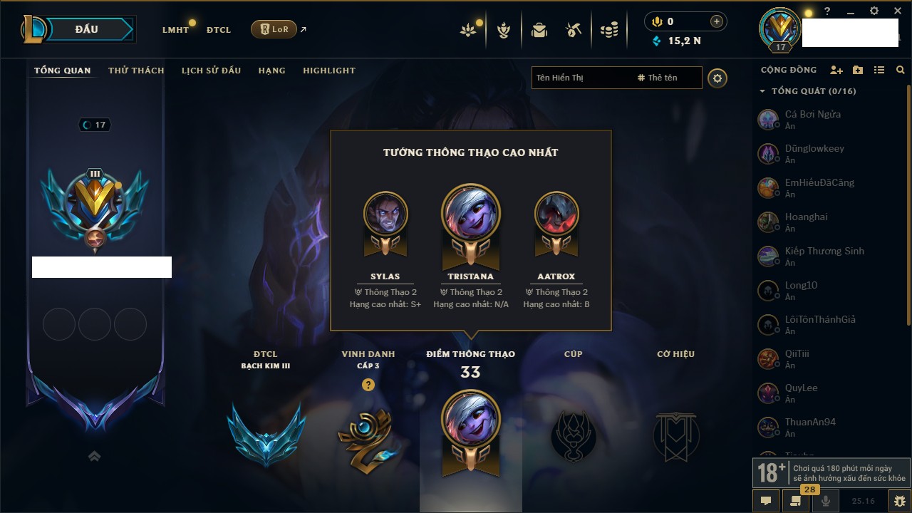 Rank Đơn: Bạc II Khung: Bạc Tướng: 170 - Còn 117834 THX Trang Phục: 192 Rank ĐTCL: Chưa Rank Linh Thú: 234