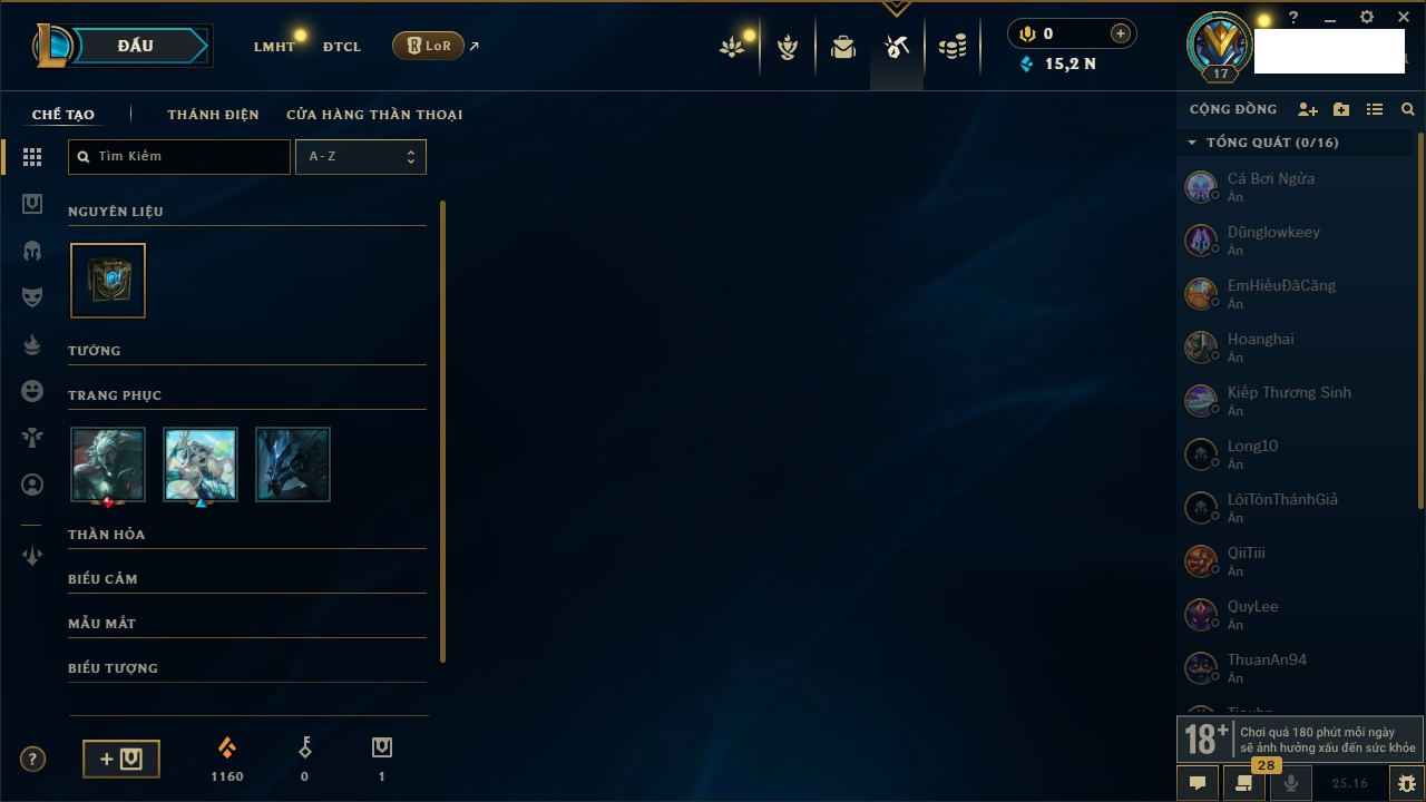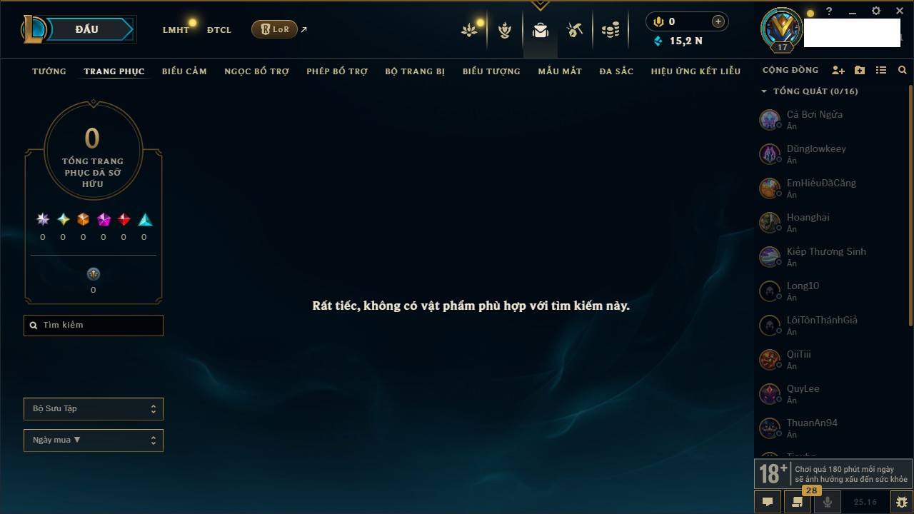 Rank Đơn: Chưa Rank Khung: Chưa có khung Tướng: 104 - Còn 10052 THX Trang Phục: 52 Rank ĐTCL: Chưa Rank Linh Thú: 155
