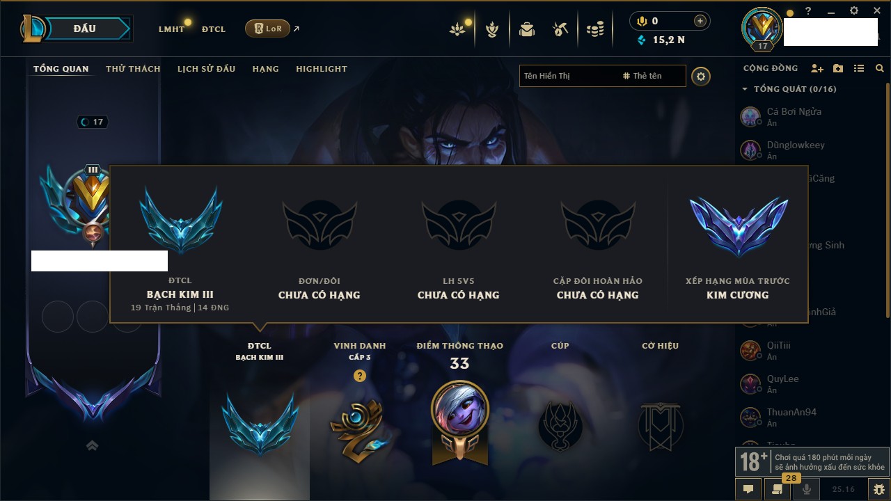 Rank Đơn: Chưa rank mùa nào Khung: Chưa có khung Tướng: 48 - Còn 9500 THX Trang Phục: 12 Rank ĐTCL: Kim Cương II Linh Thú: 128