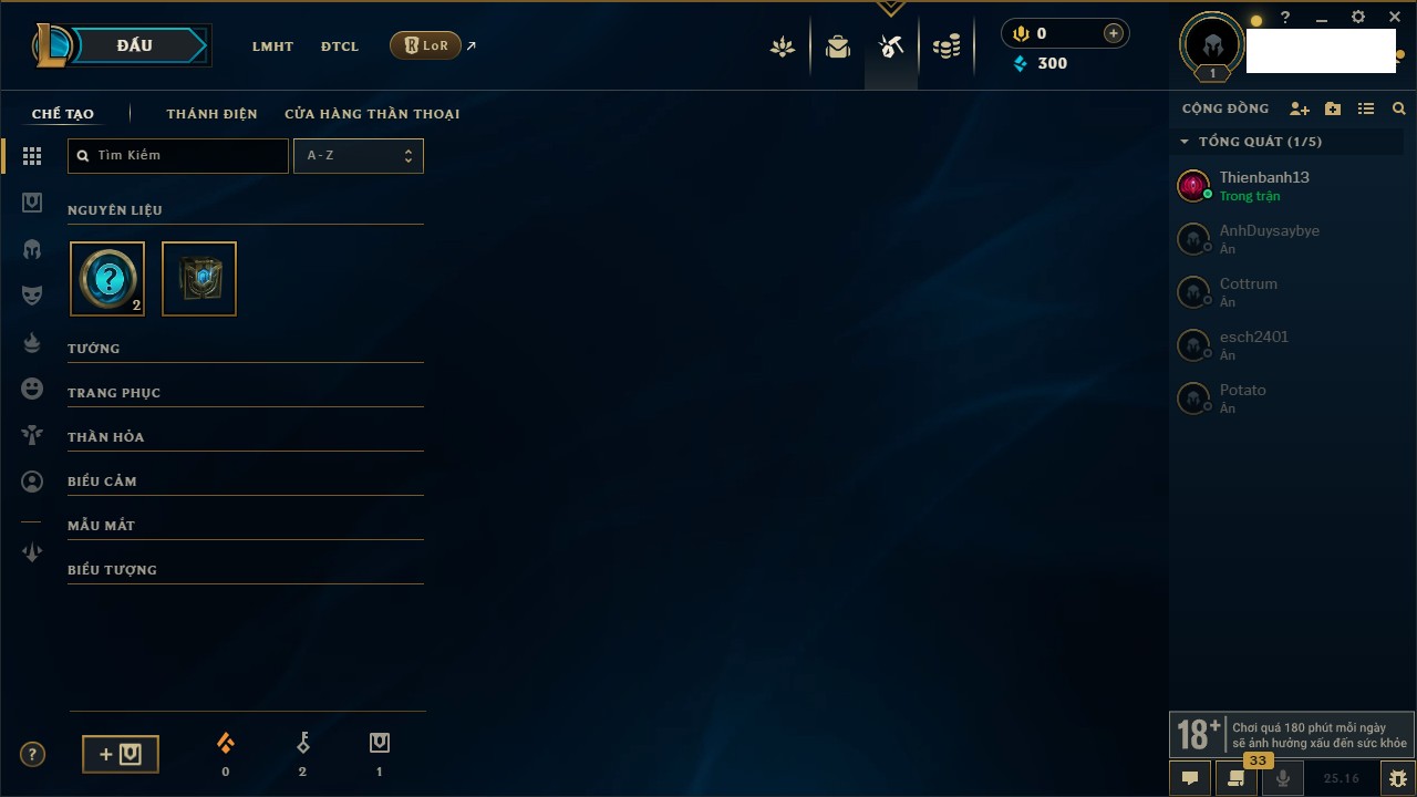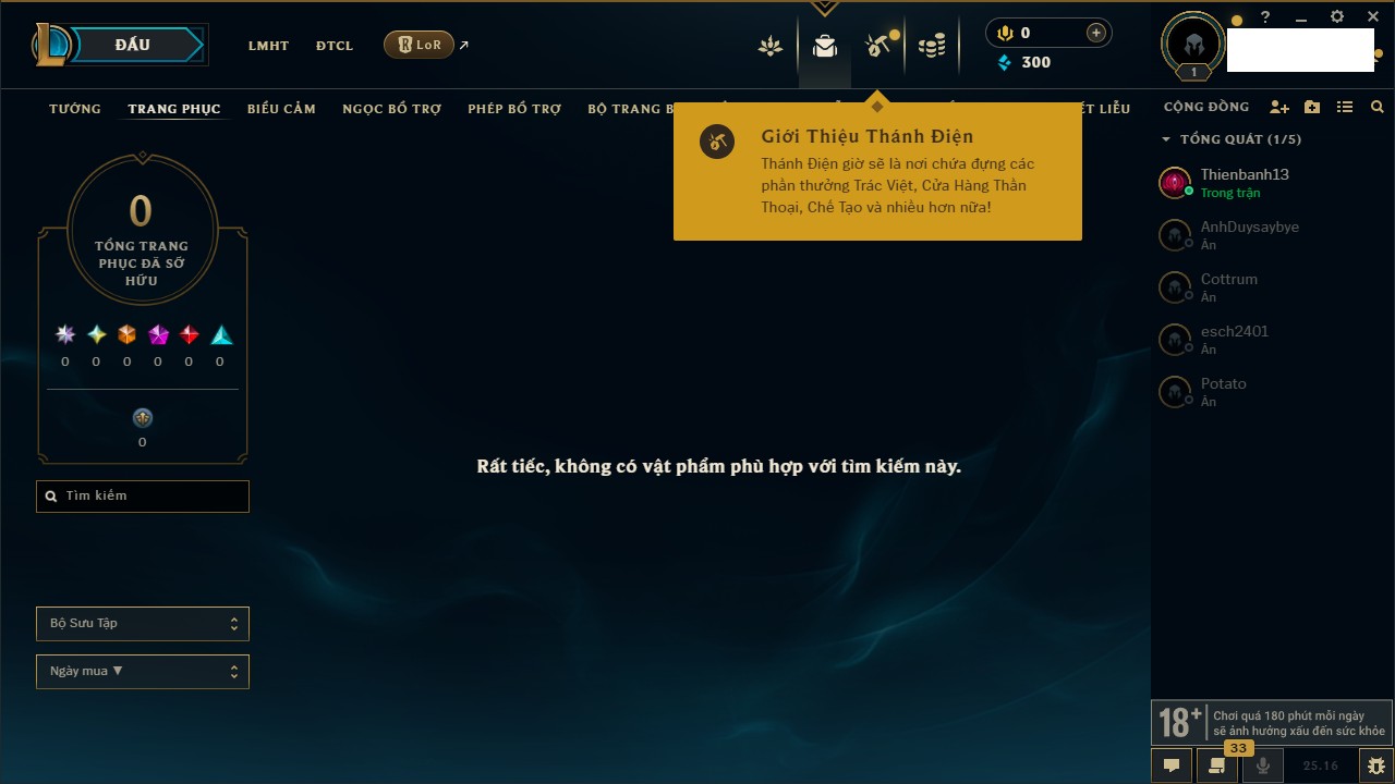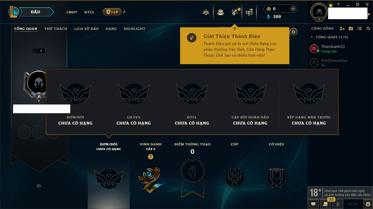Rank Đơn: Chưa rank mùa nàoKhung: Chưa có khungTướng: 0 - Còn 0 THXTrang Phục: 0Rank ĐTCL: Chưa RankLinh Thú: 56