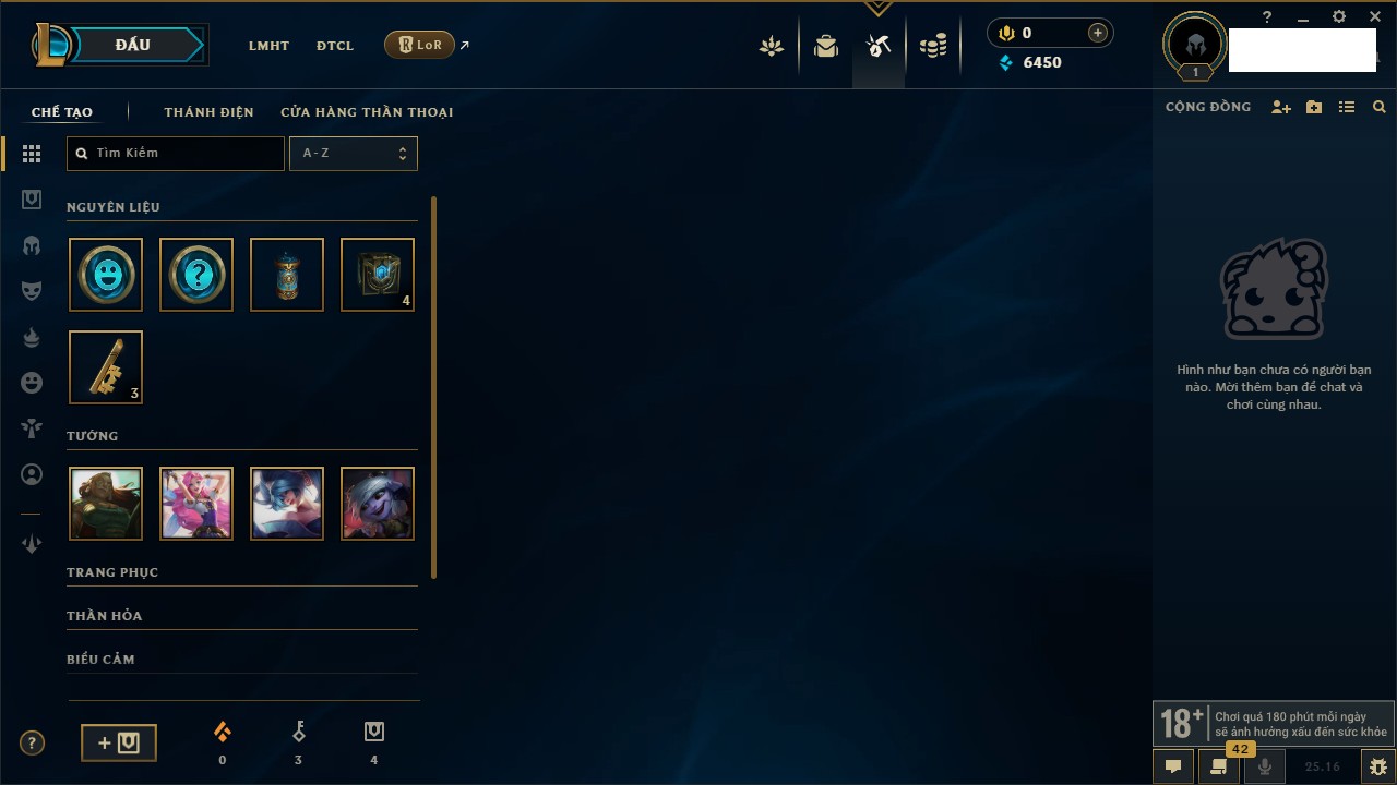 Rank Đơn: Bạch Kim IVKhung: Bạch kimTướng: 171 - Còn 182788 THXTrang Phục: 158Rank ĐTCL: Lục Bảo IVLinh Thú: 56
