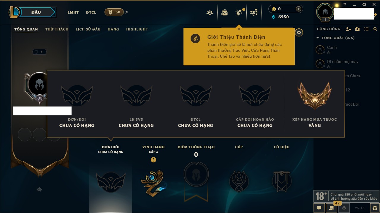 Rank Đơn: Chưa rank mùa nàoKhung: Chưa có khungTướng: 2 - Còn 9000 THXTrang Phục: 0Rank ĐTCL: Bạch Kim IIILinh Thú: 31