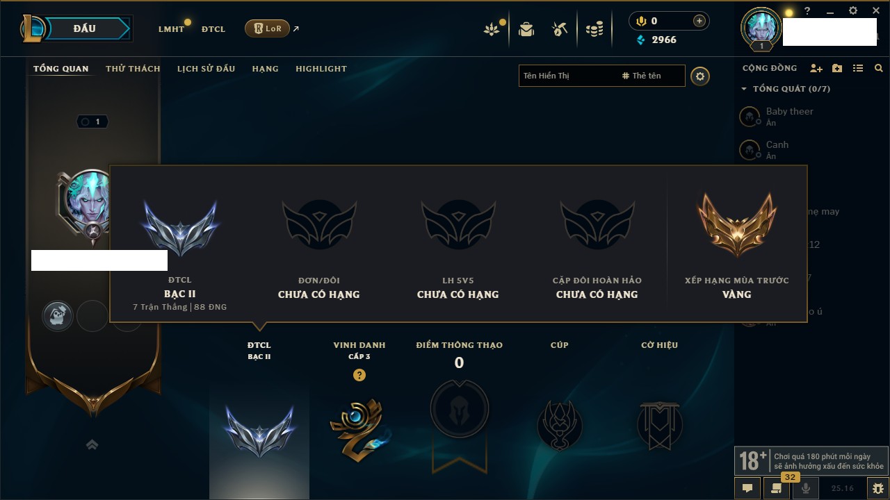 Rank Đơn: Chưa RankKhung: Chưa có khungTướng: 27 - Còn 170 THXTrang Phục: 0Rank ĐTCL: Chưa RankLinh Thú: 33