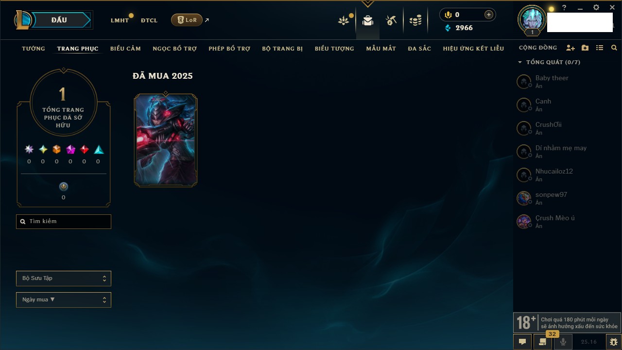 Rank Đơn: Chưa RankKhung: Chưa có khungTướng: 22 - Còn 1295 THXTrang Phục: 1Rank ĐTCL: Chưa RankLinh Thú: 5