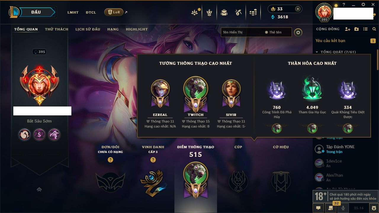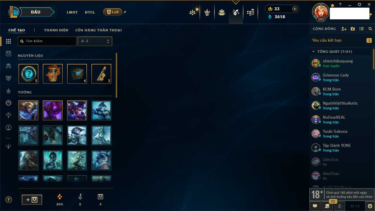 Rank Đơn: Vàng IVKhung: BạcTướng: 166 - Còn 180925 THXTrang Phục: 163Rank ĐTCL: Chưa RankLinh Thú: 67