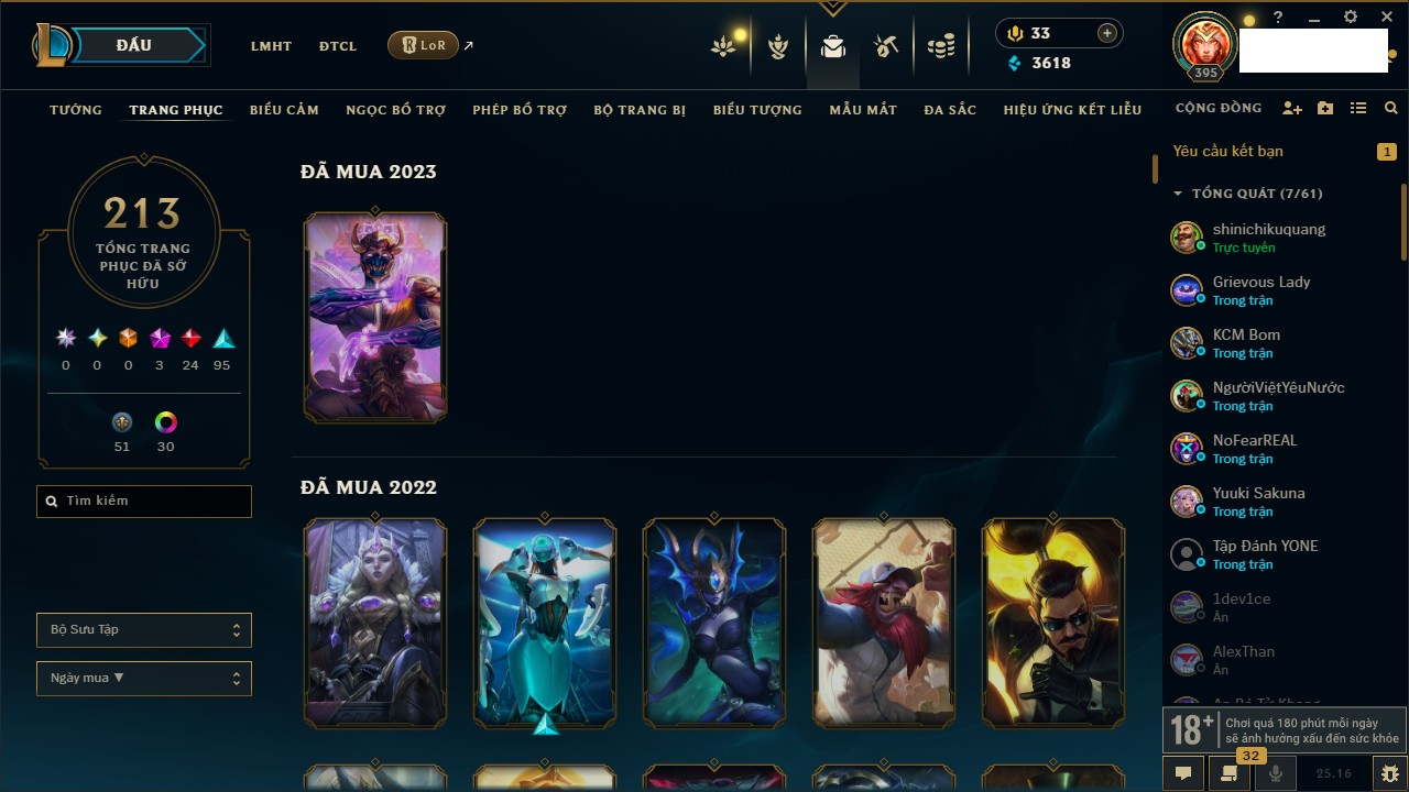 Rank Đơn: Vàng IVKhung: VàngTướng: 171 - Còn 48721 THXTrang Phục: 171Rank ĐTCL: Chưa RankLinh Thú: 27