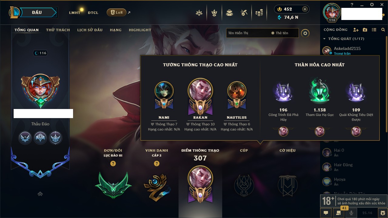Rank Đơn: Chưa rank mùa nào Khung: Chưa có khung Tướng: 48 - Còn 9500 THX Trang Phục: 12 Rank ĐTCL: Kim Cương II Linh Thú: 128
