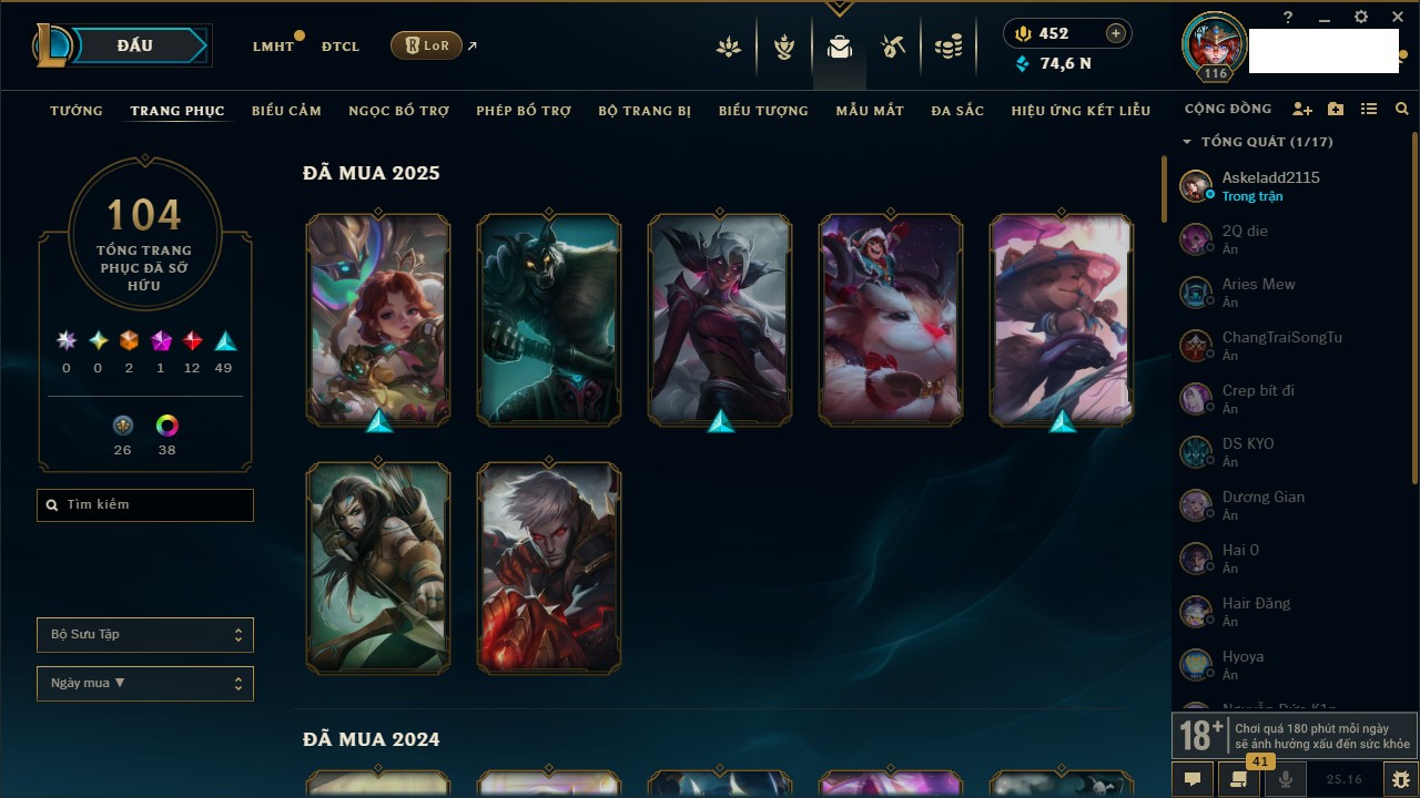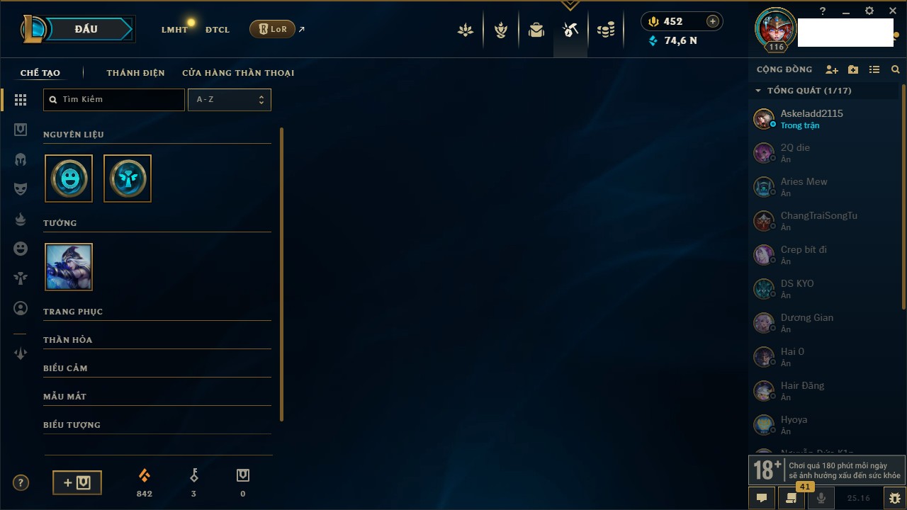 Rank Đơn: Chưa Rank Khung: Chưa có khung Tướng: 104 - Còn 10052 THX Trang Phục: 52 Rank ĐTCL: Chưa Rank Linh Thú: 155
