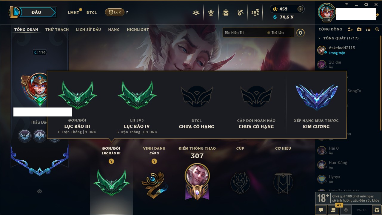 Rank Đơn: Bạc IV Khung: Vàng Tướng: 172 - Còn 11123 THX Trang Phục: 288 Rank ĐTCL: Vàng IV Linh Thú: 117