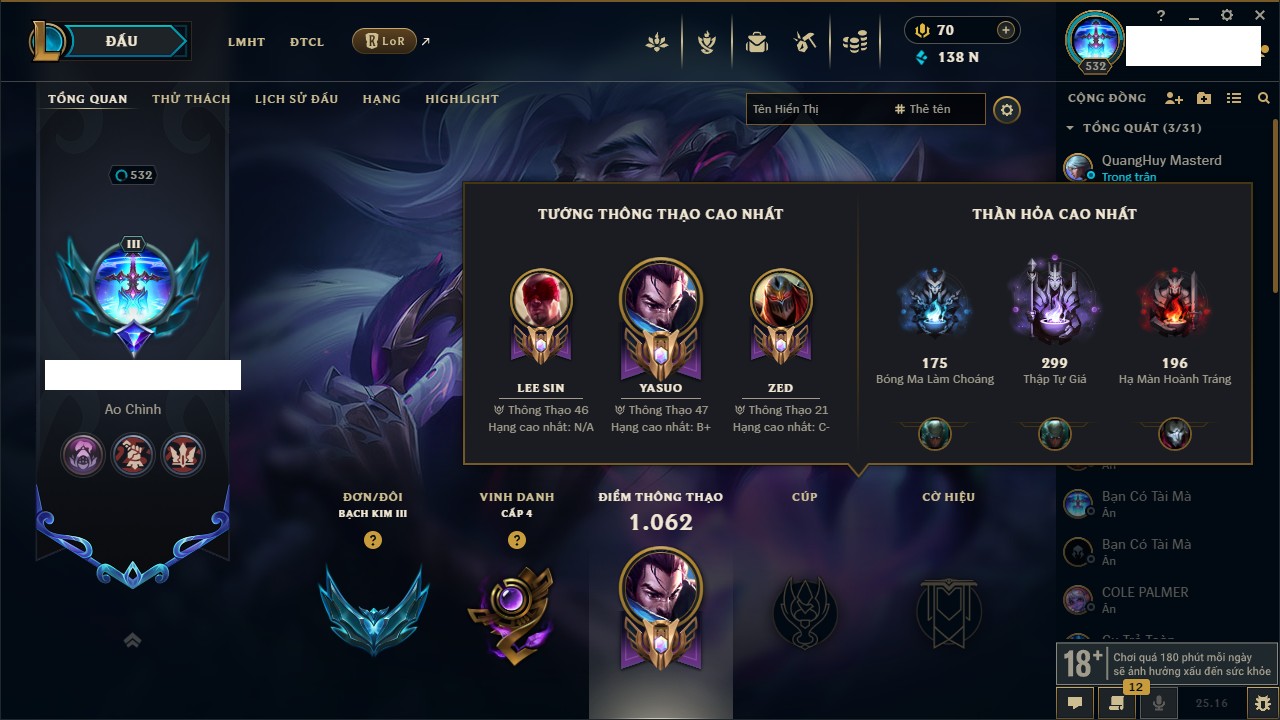 Rank Đơn: Bạc III Khung: Bạc Tướng: 170 - Còn 30078 THX Trang Phục: 225 Rank ĐTCL: Chưa Rank Linh Thú: 138