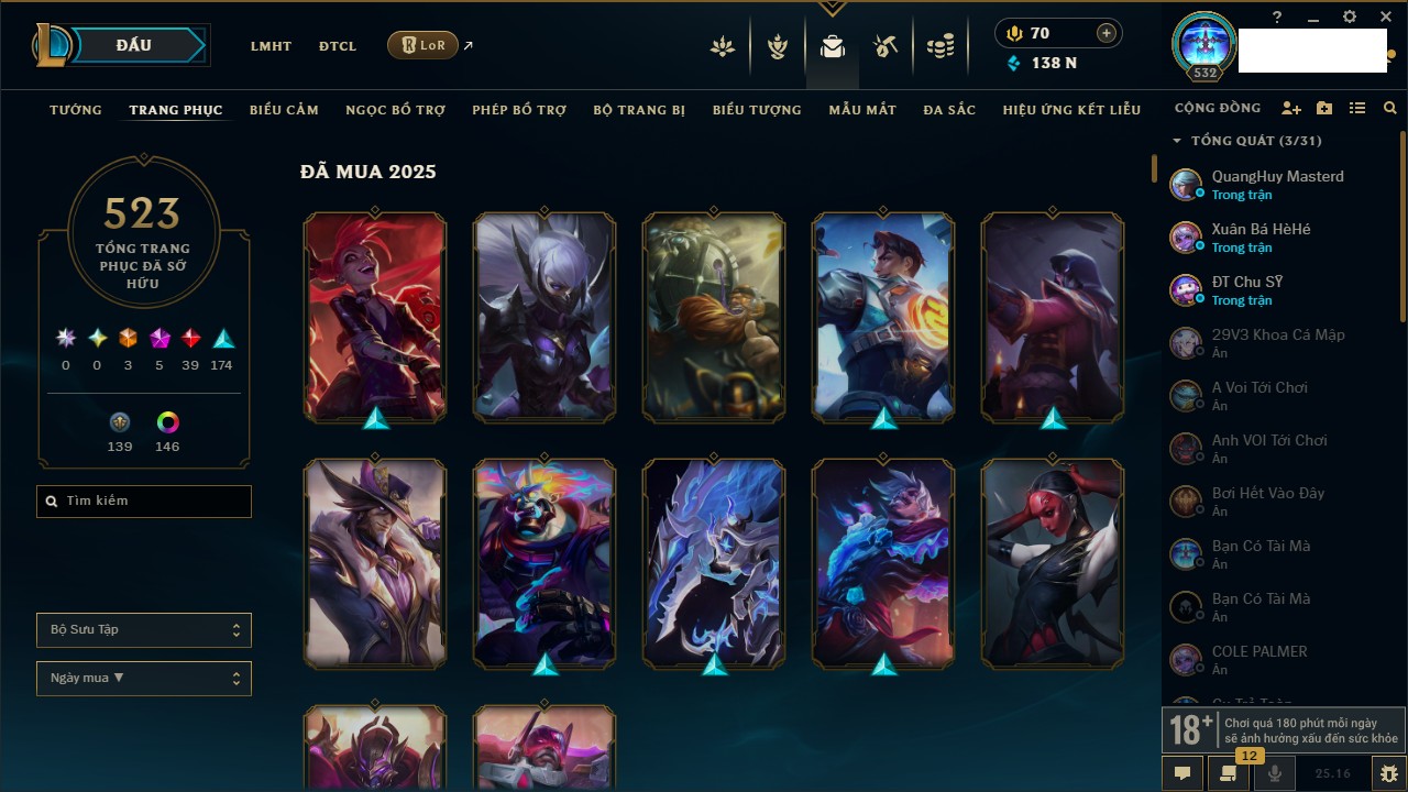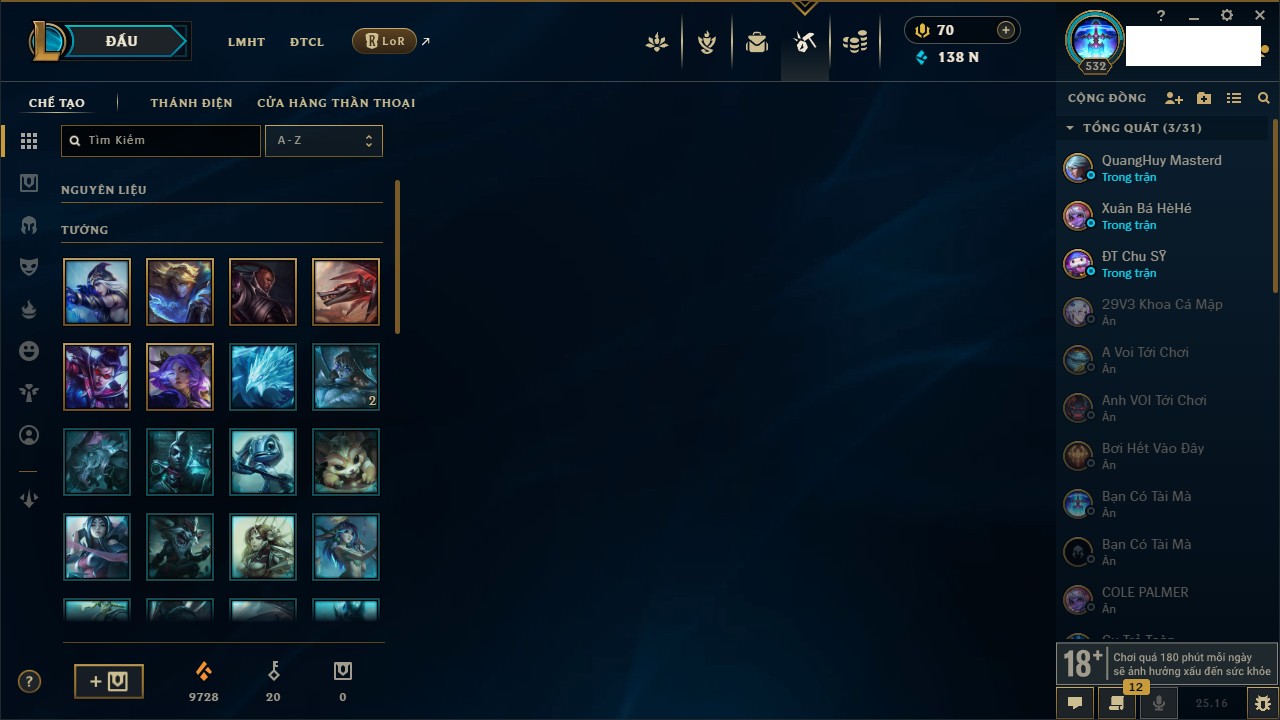 Rank Đơn: Vàng III Khung: Vàng Tướng: 171 - Còn 91047 THX Trang Phục: 98 Rank ĐTCL: Bạch Kim IV Linh Thú: 281