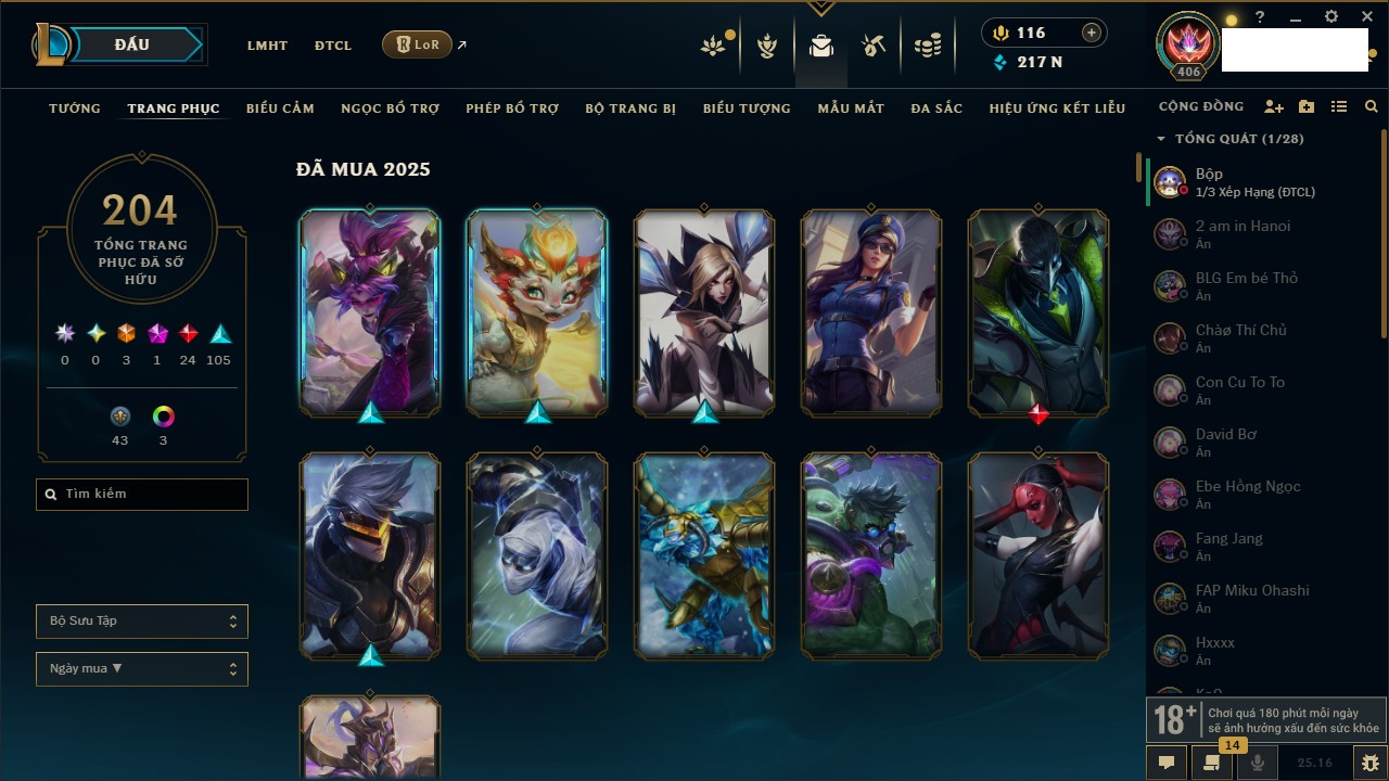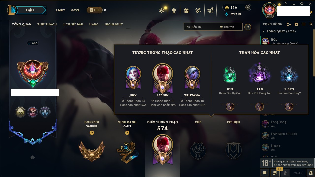 Rank Đơn: Bạch Kim IIKhung: Bạch kimTướng: 171 - Còn 316137 THXTrang Phục: 89Rank ĐTCL: Bạch Kim IIILinh Thú: 94