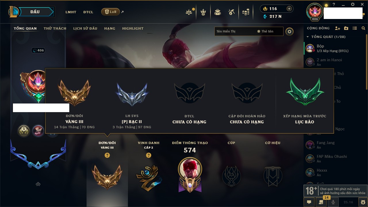 Rank Đơn: Bạch Kim IIIKhung: Bạch kimTướng: 171 - Còn 136108 THXTrang Phục: 261Rank ĐTCL: Bạc IVLinh Thú: 73