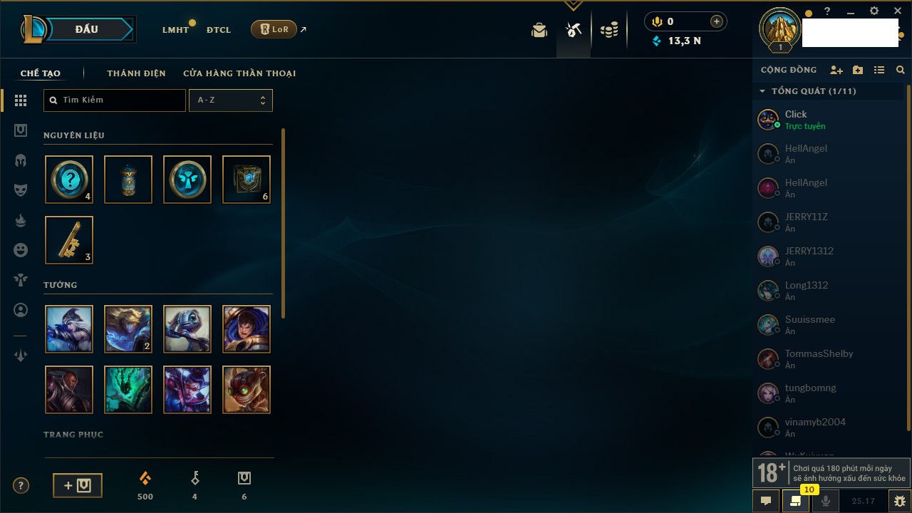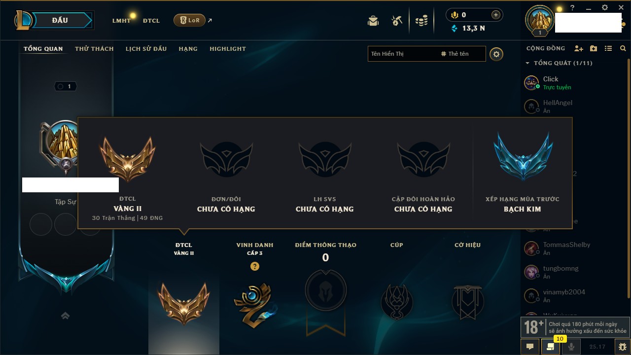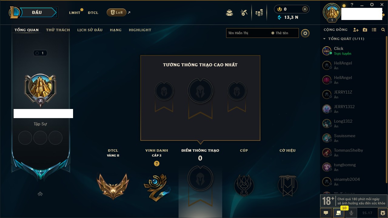 Rank Đơn: Vàng IIIKhung: BạcTướng: 171 - Còn 101359 THXTrang Phục: 88Rank ĐTCL: Kim Cương IVLinh Thú: 200