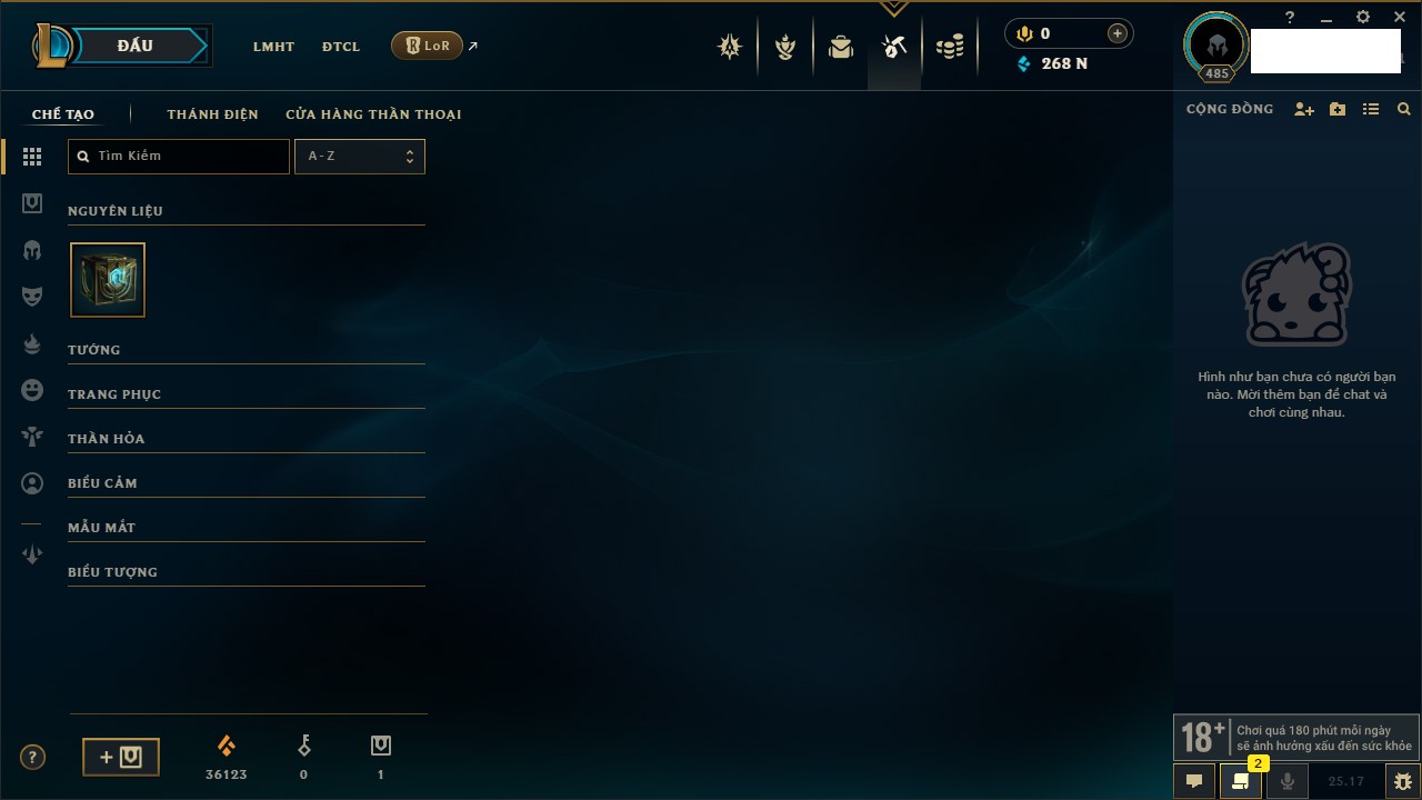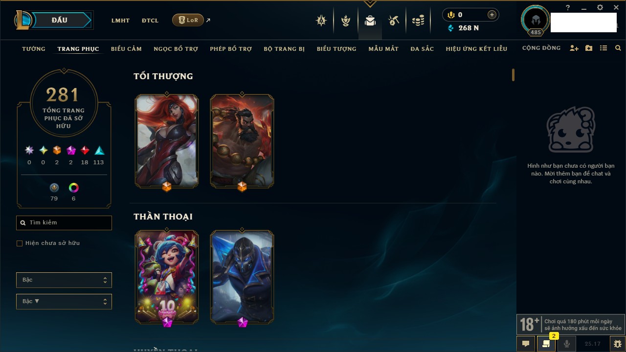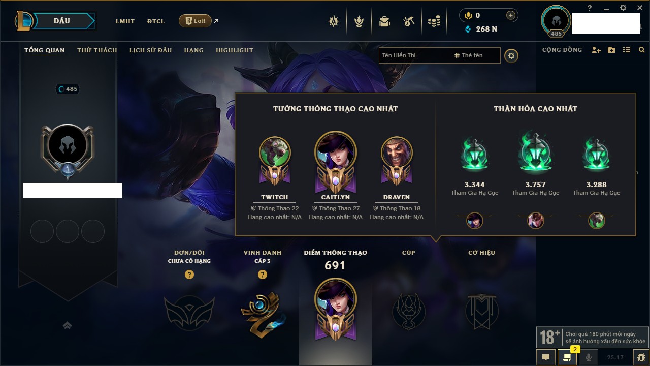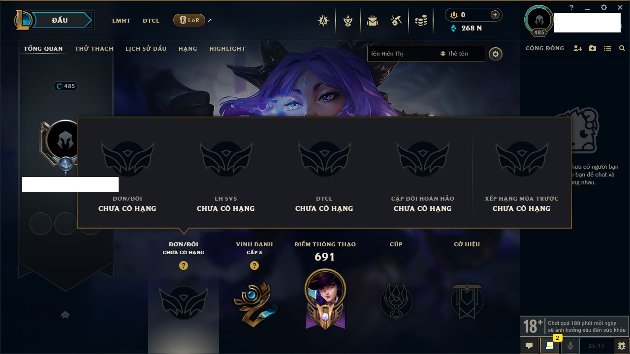 Rank Đơn: Vàng IIKhung: VàngTướng: 171 - Còn 219803 THXTrang Phục: 254Rank ĐTCL: Chưa RankLinh Thú: 78
