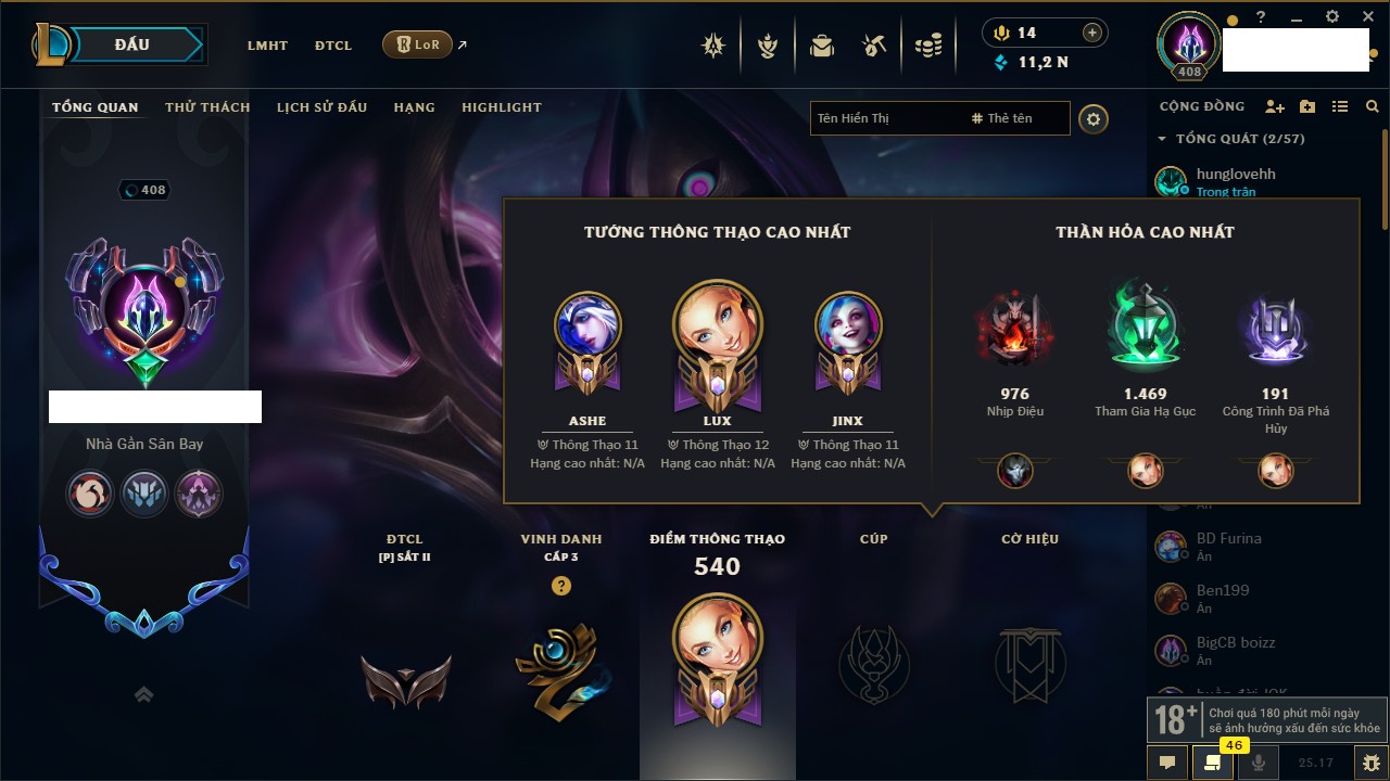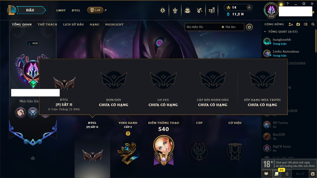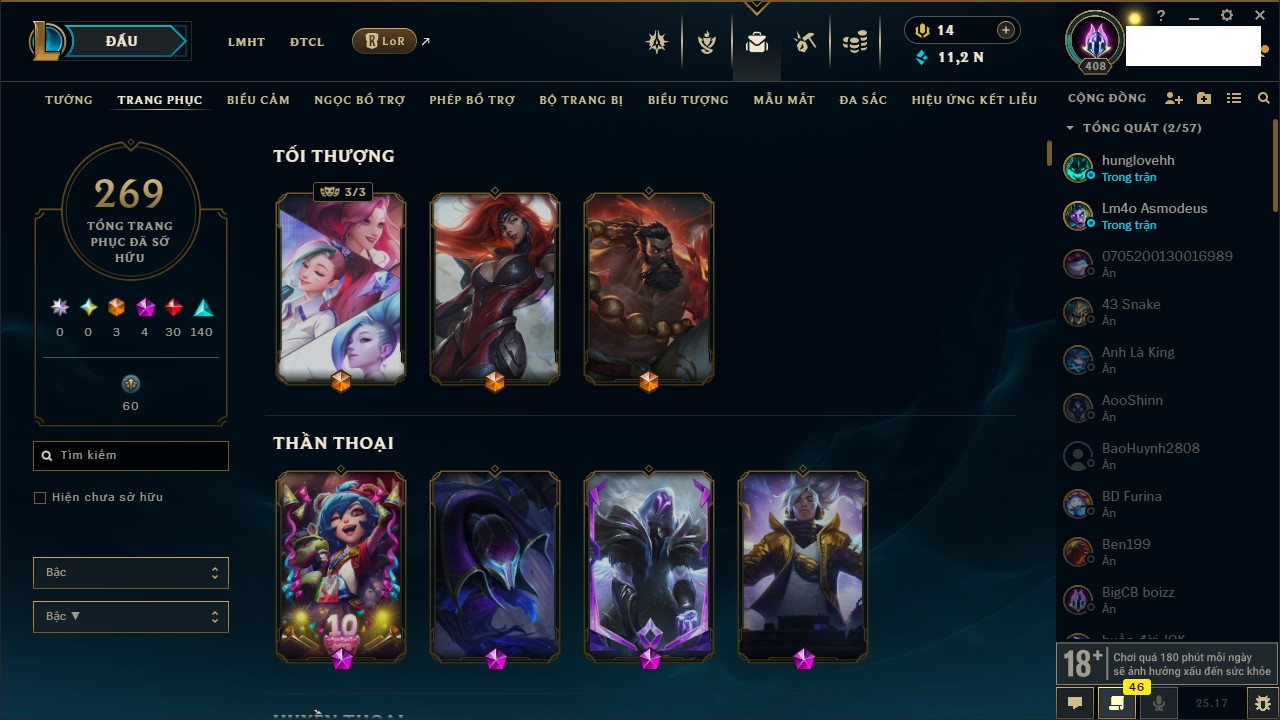 Rank Đơn: Vàng IIKhung: VàngTướng: 171 - Còn 219803 THXTrang Phục: 254Rank ĐTCL: Chưa RankLinh Thú: 78