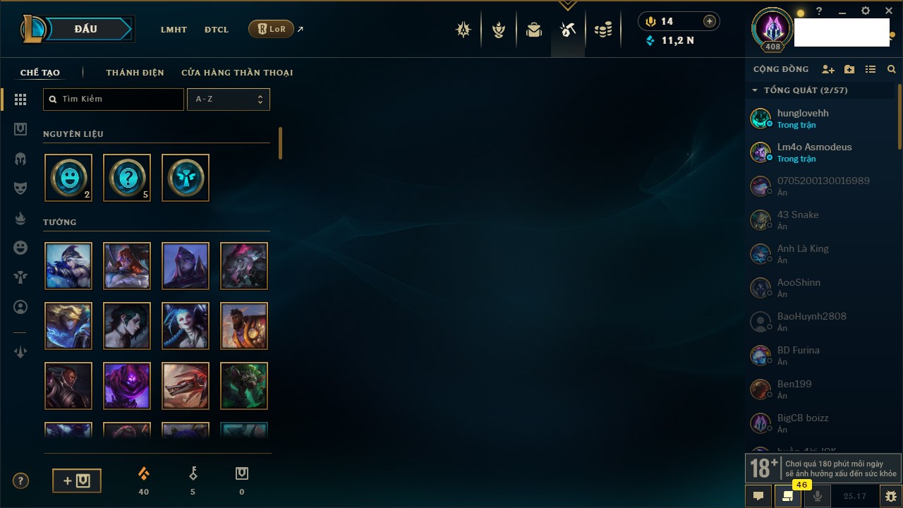 Rank Đơn: Bạch Kim IVKhung: VàngTướng: 171 - Còn 130280 THXTrang Phục: 226Rank ĐTCL: Kim Cương IVLinh Thú: 183