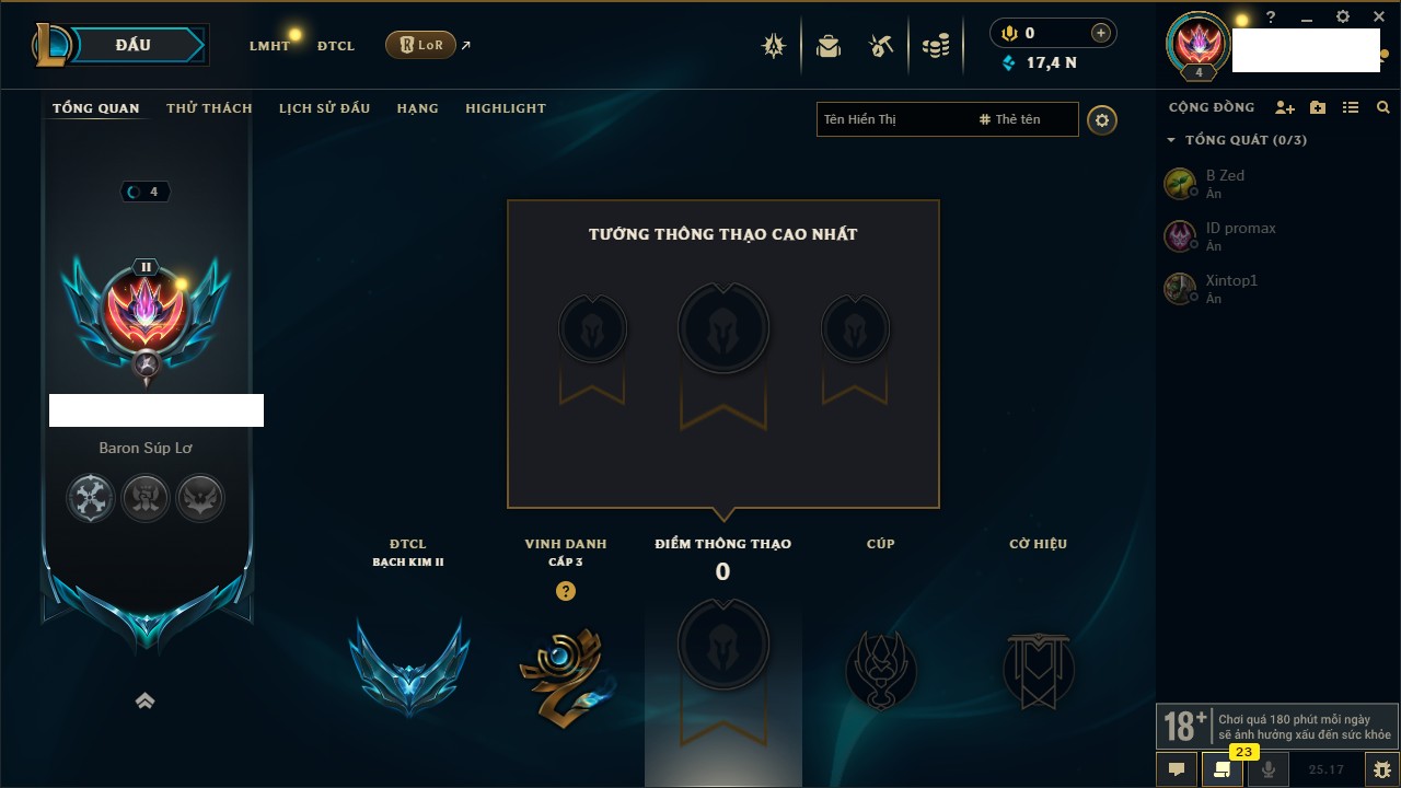 Rank Đơn: Bạc IIKhung: Chưa có khungTướng: 145 - Còn 12230 THXTrang Phục: 183Rank ĐTCL: Chưa RankLinh Thú: 71