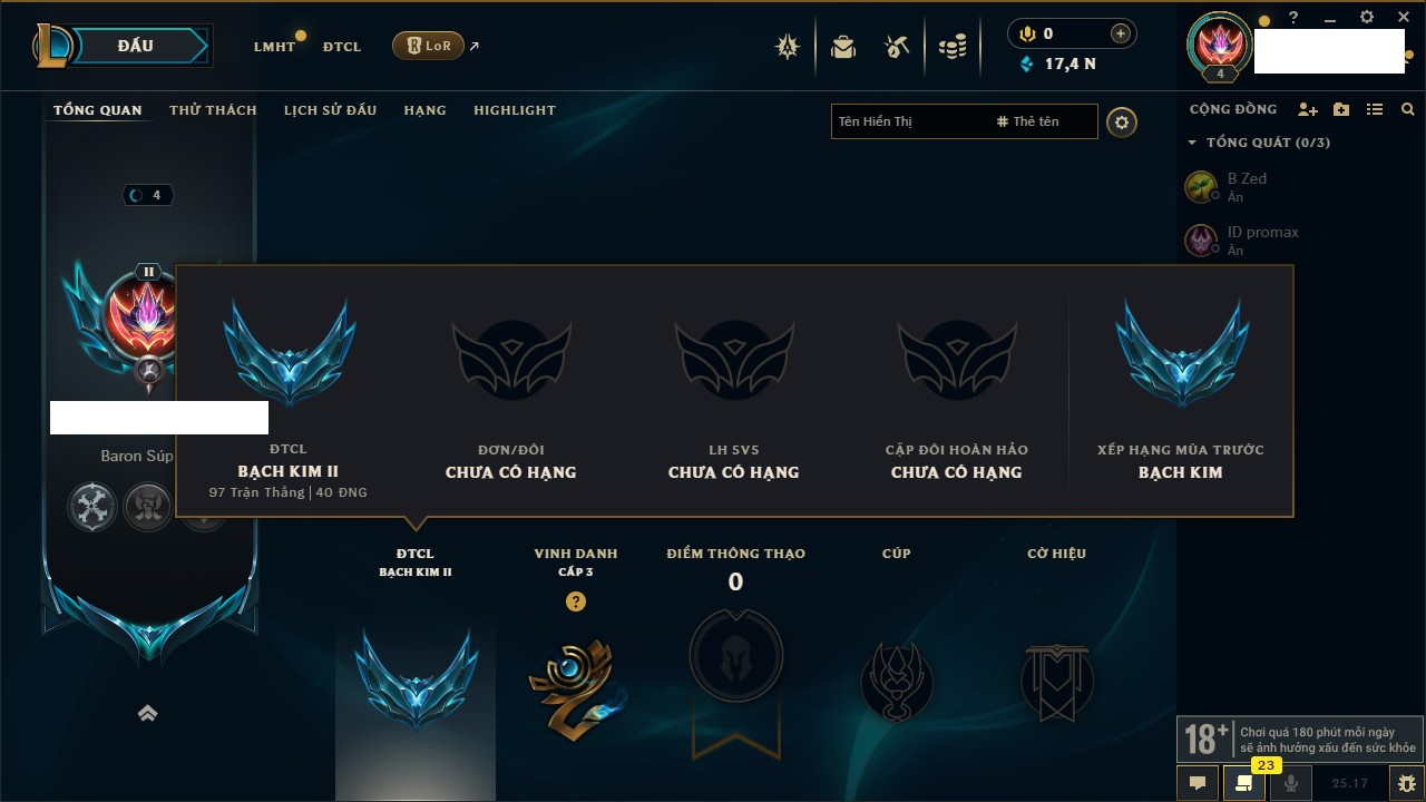 Rank Đơn: Bạch Kim IVKhung: Bạch kimTướng: 172 - Còn 326966 THXTrang Phục: 234Rank ĐTCL: Kim Cương IVLinh Thú: 167