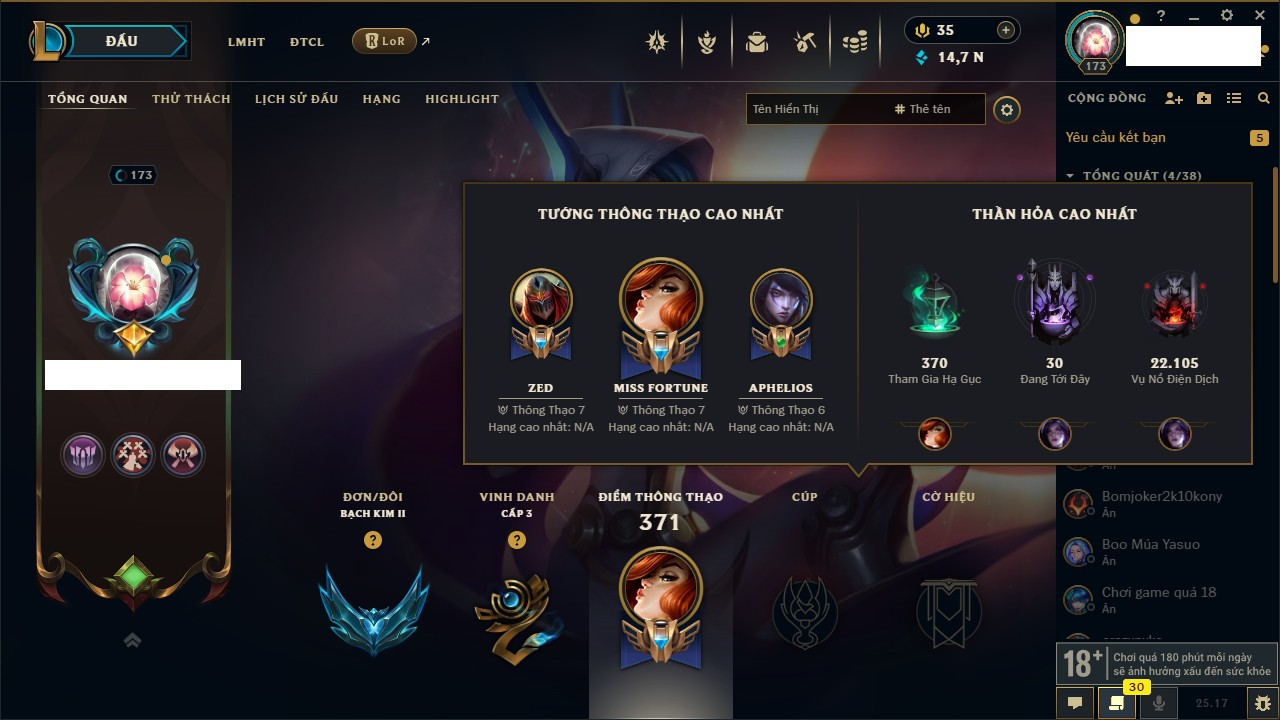 Rank Đơn: Đồng IIKhung: ĐồngTướng: 170 - Còn 66145 THXTrang Phục: 215Rank ĐTCL: Chưa RankLinh Thú: 52