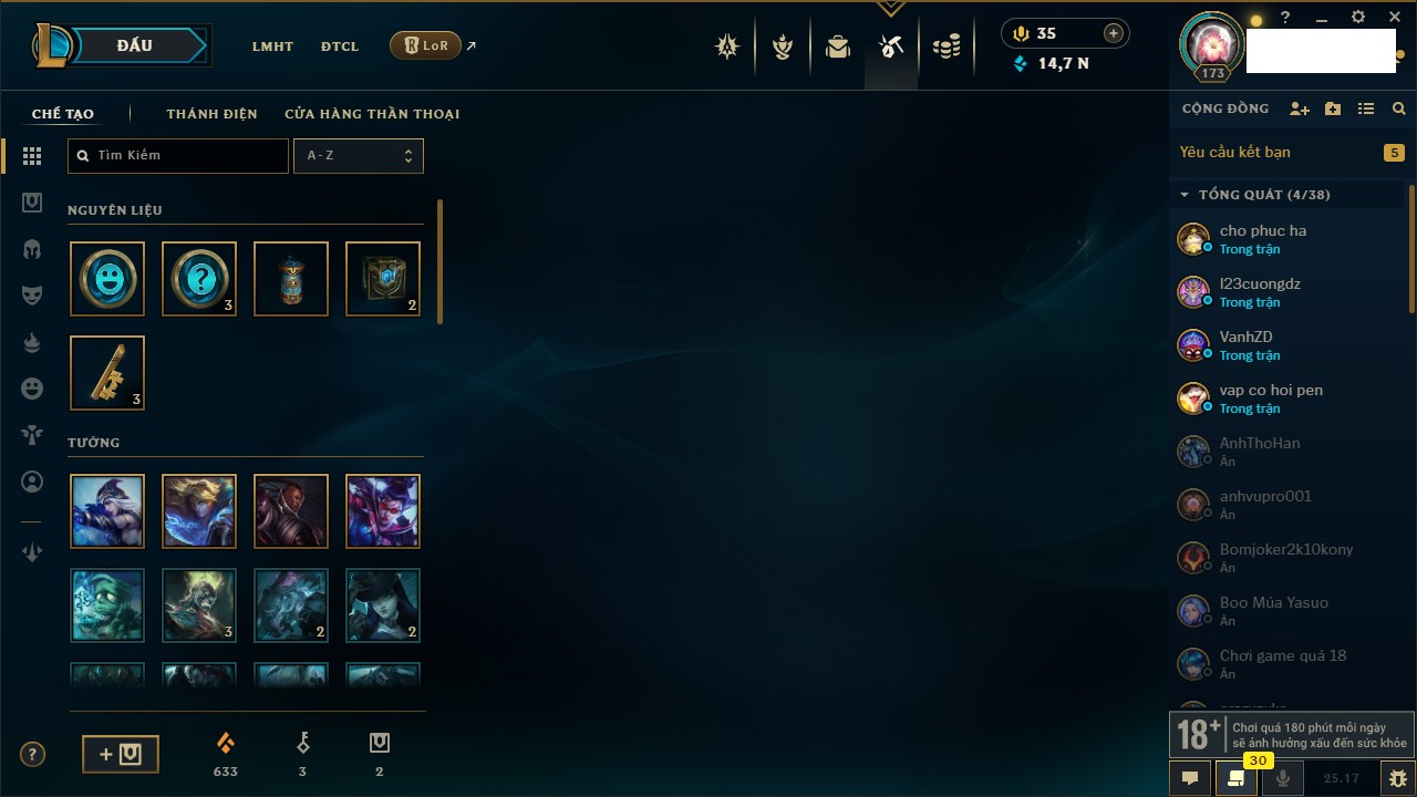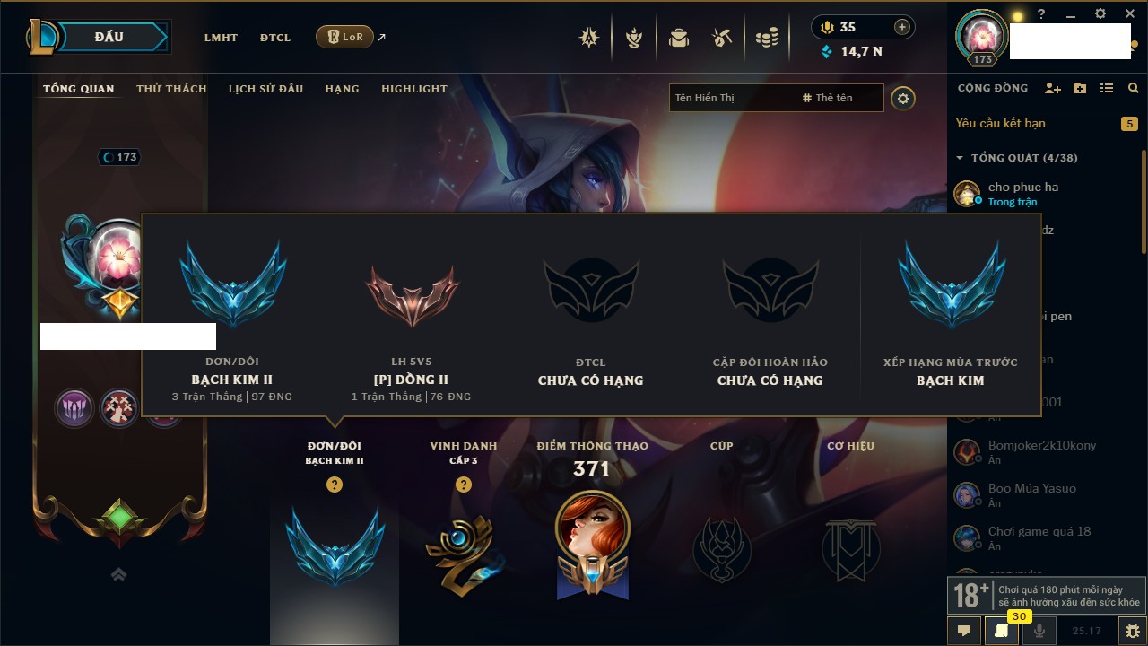 Rank Đơn: Vàng IIIKhung: BạcTướng: 171 - Còn 101359 THXTrang Phục: 88Rank ĐTCL: Kim Cương IVLinh Thú: 200