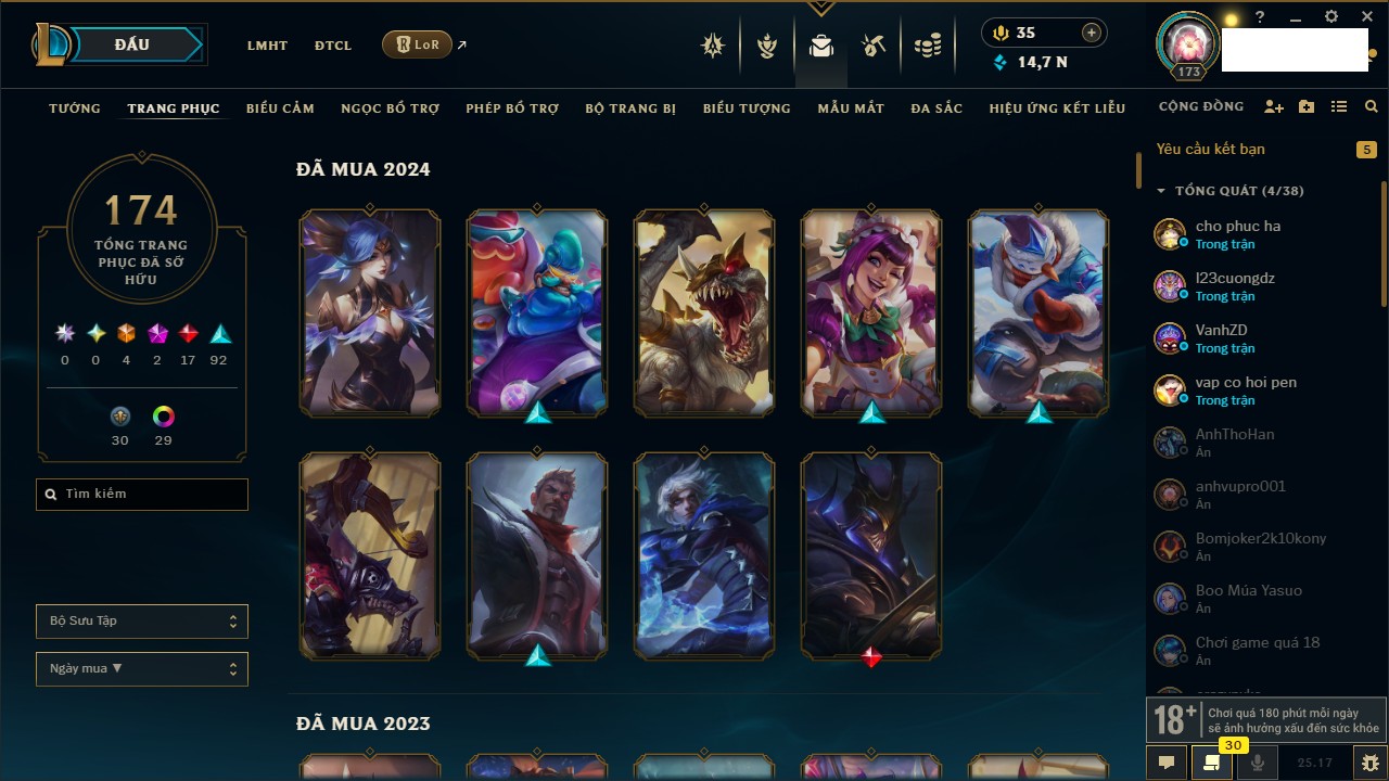 Rank Đơn: Lục Bảo IVKhung: Bạch kimTướng: 171 - Còn 128452 THXTrang Phục: 193Rank ĐTCL: Bạc IIILinh Thú: 100