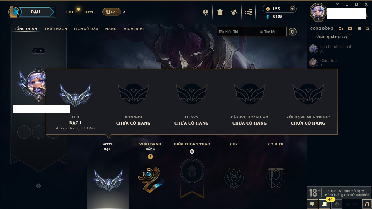 Rank Đơn: Vàng IIIKhung: BạcTướng: 171 - Còn 101359 THXTrang Phục: 88Rank ĐTCL: Kim Cương IVLinh Thú: 200