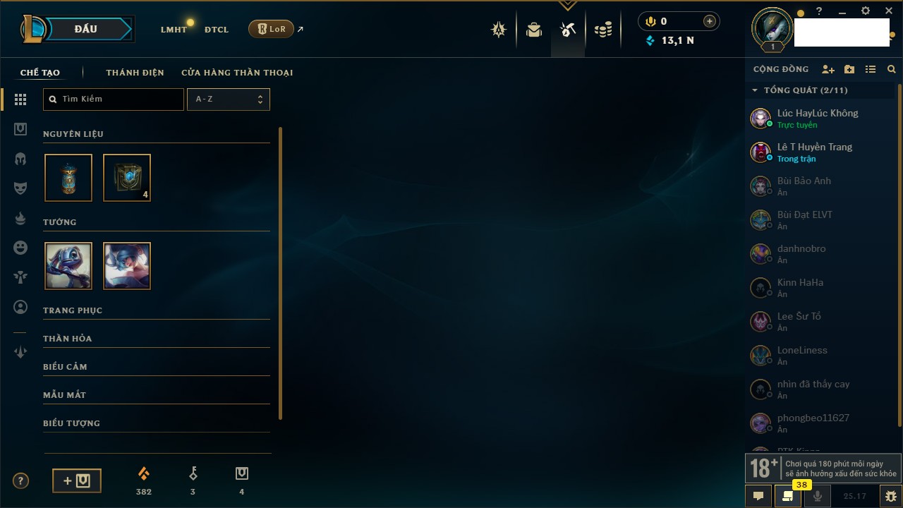 Rank Đơn: Chưa RankKhung: Chưa có khungTướng: 165 - Còn 3214 THXTrang Phục: 160Rank ĐTCL: Chưa RankLinh Thú: 28