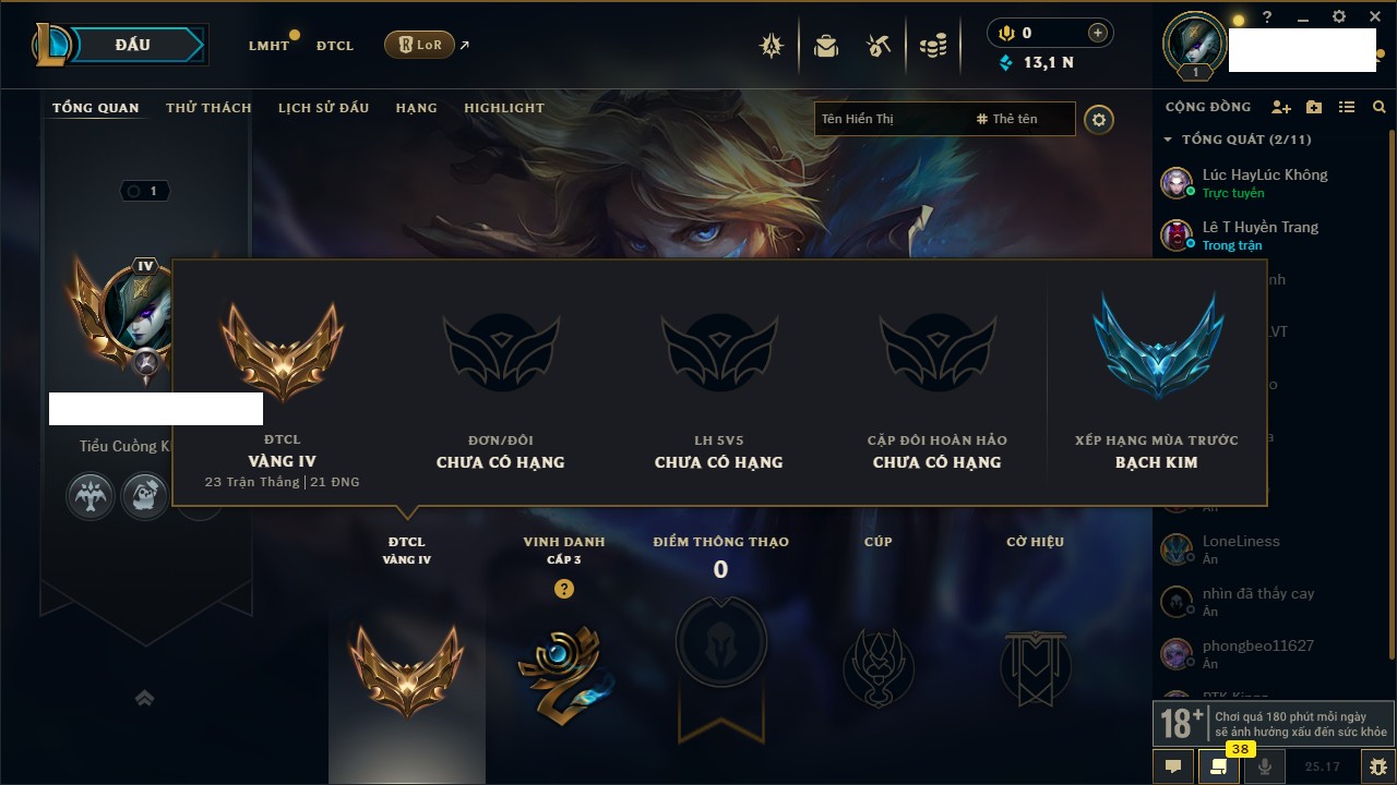 Rank Đơn: Chưa RankKhung: Chưa có khungTướng: 37 - Còn 27387 THXTrang Phục: 10Rank ĐTCL: Chưa RankLinh Thú: 1