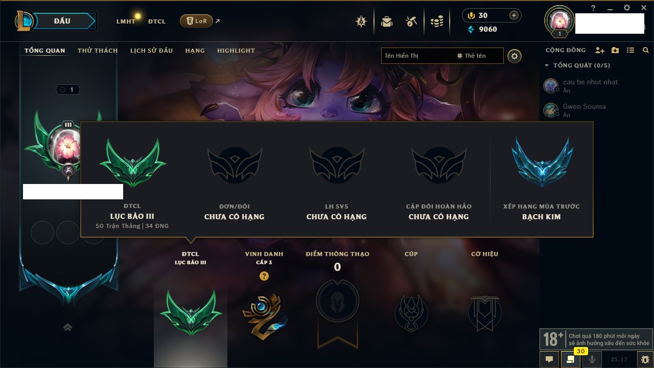 Rank Đơn: Bạc IV Khung: Vàng Tướng: 172 - Còn 11123 THX Trang Phục: 288 Rank ĐTCL: Vàng IV Linh Thú: 117