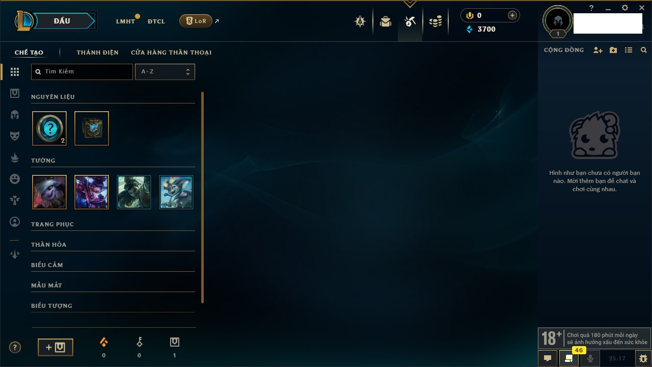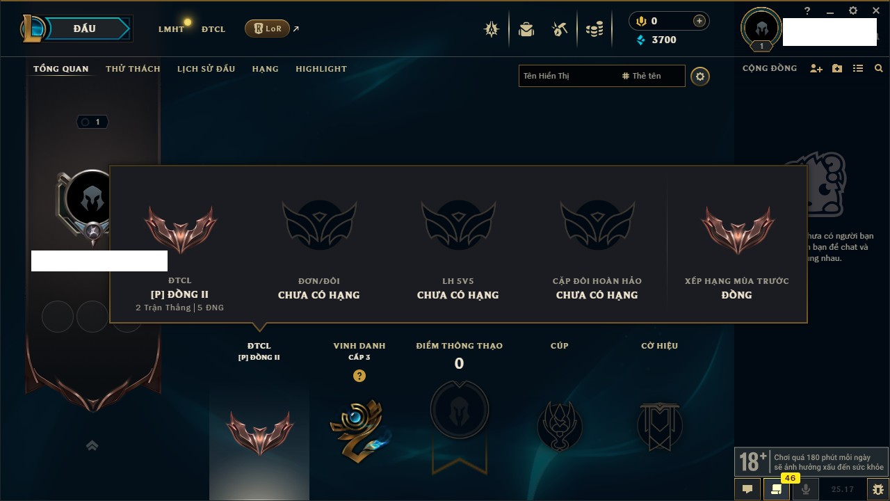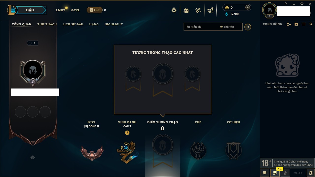 Rank Đơn: Chưa rank mùa nàoKhung: Chưa có khungTướng: 3 - Còn 34550 THXTrang Phục: 0Rank ĐTCL: Bạch Kim IVLinh Thú: 41