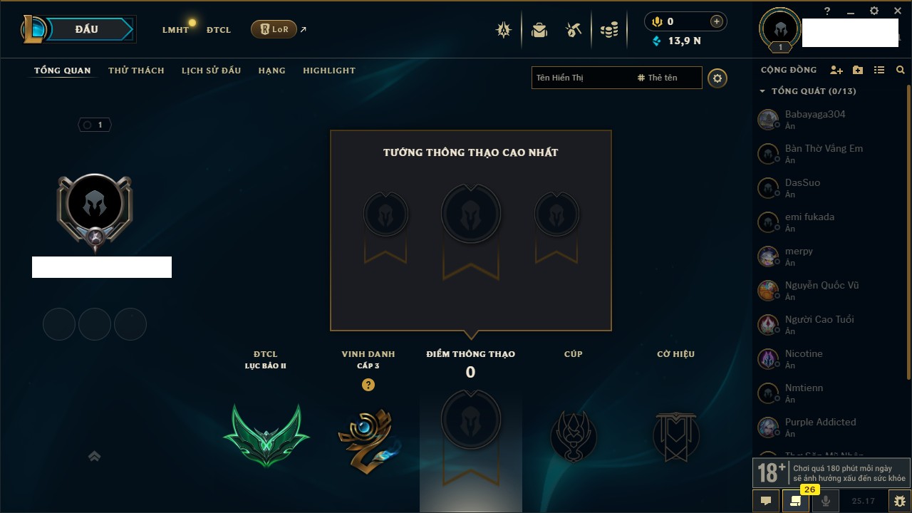 Rank Đơn: Chưa rank mùa nàoKhung: Chưa có khungTướng: 0 - Còn 0 THXTrang Phục: 0Rank ĐTCL: Chưa RankLinh Thú: 56