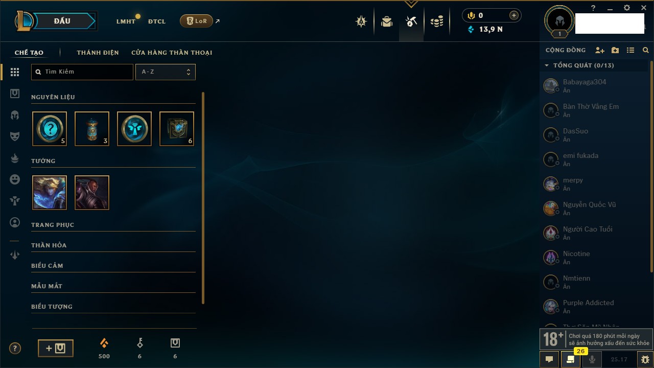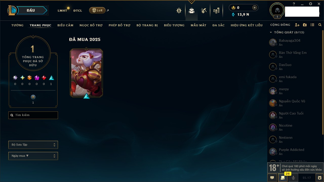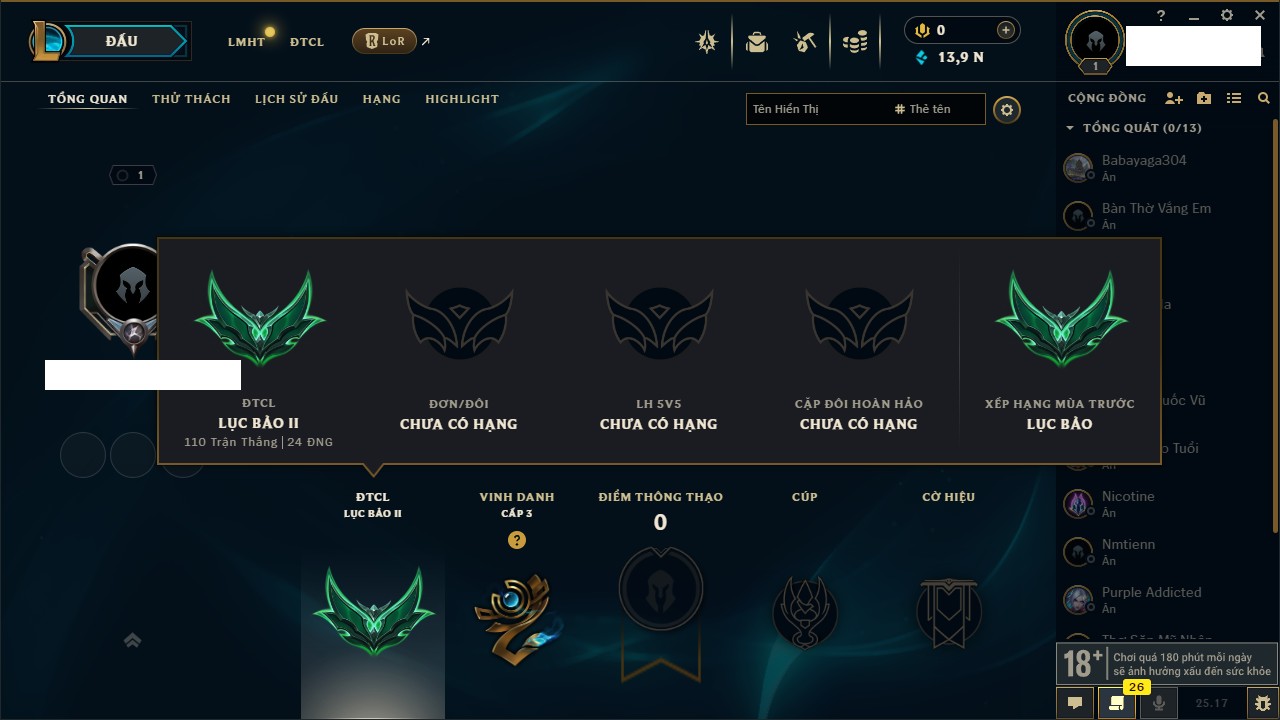 Rank Đơn: Chưa RankKhung: Chưa có khungTướng: 170 - Còn 72514 THXTrang Phục: 202Rank ĐTCL: Chưa RankLinh Thú: 191