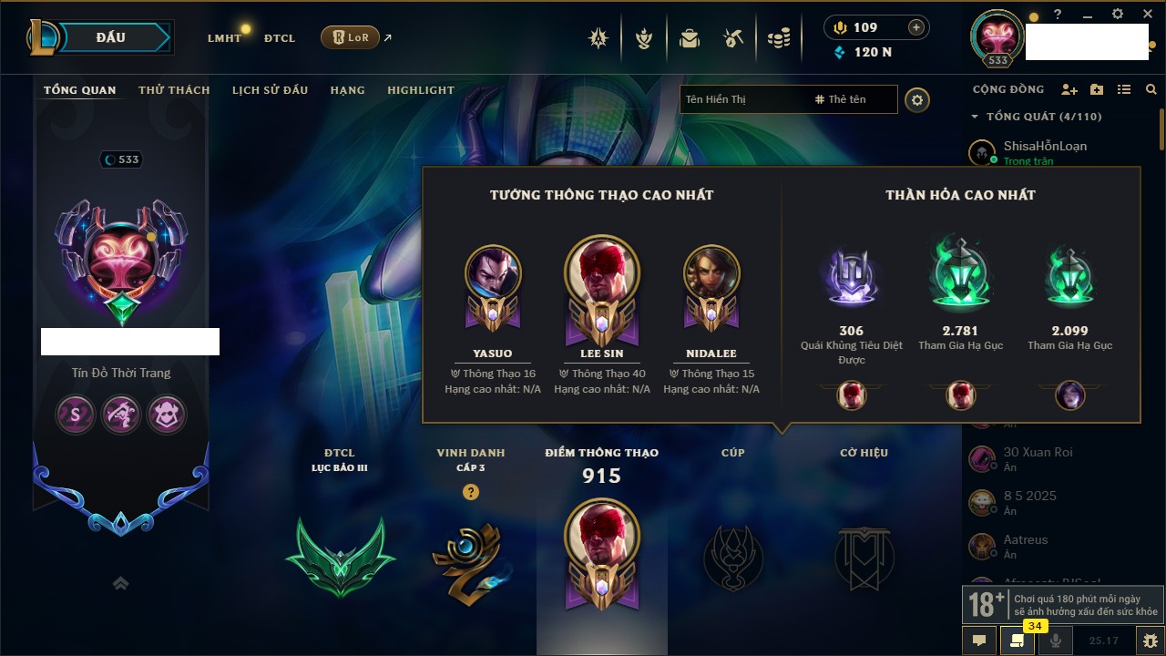 Rank Đơn: Bạc IIKhung: Bạch kimTướng: 169 - Còn 81813 THXTrang Phục: 301Rank ĐTCL: Chưa RankLinh Thú: 140