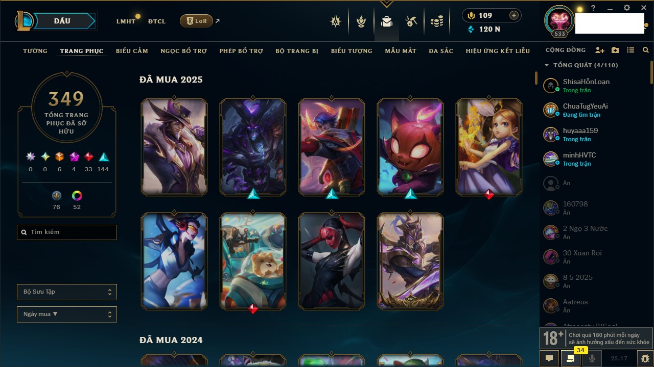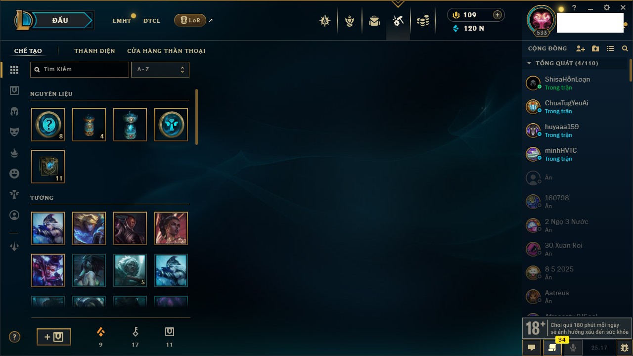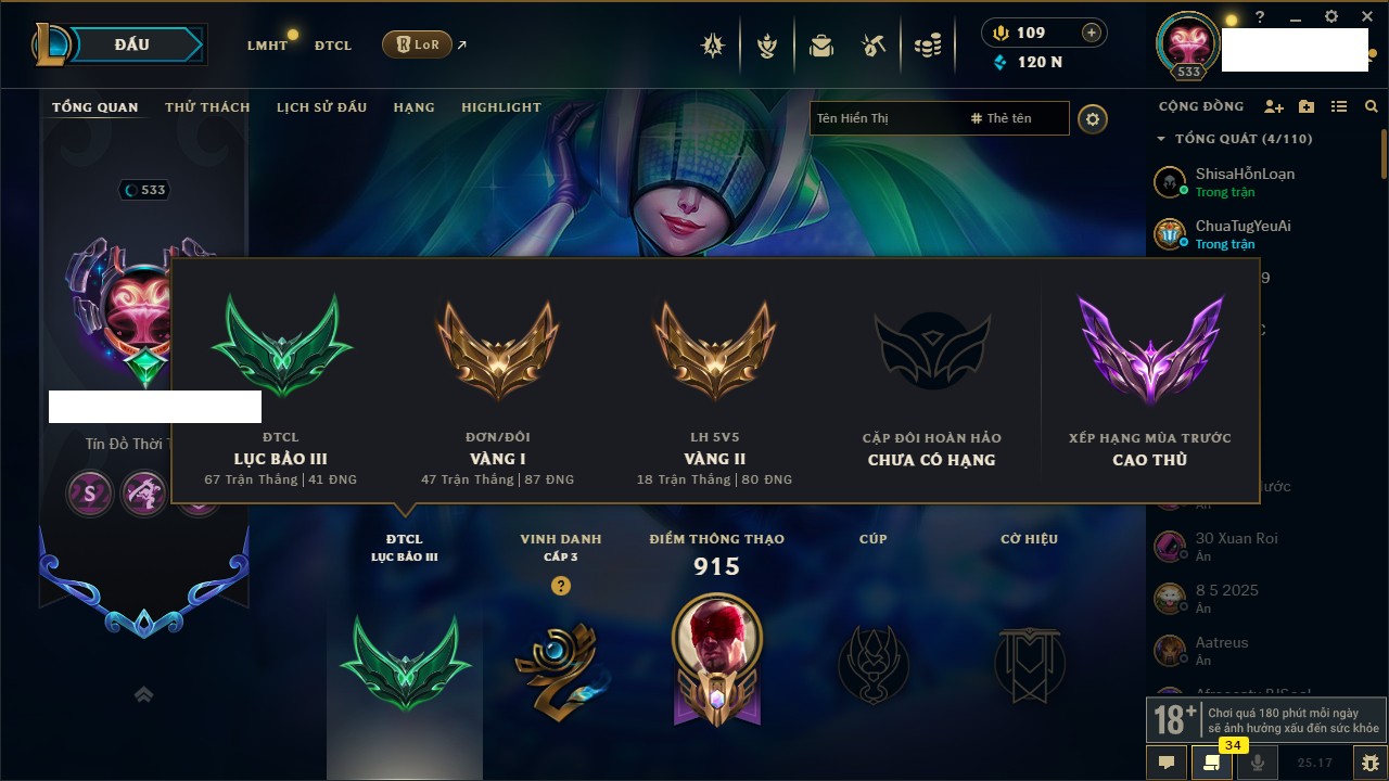 Rank Đơn: Sắt IVKhung: SắtTướng: 171 - Còn 231744 THXTrang Phục: 376Rank ĐTCL: Bạch Kim IILinh Thú: 120