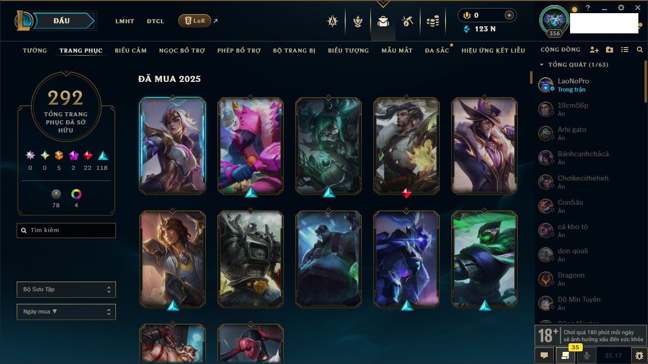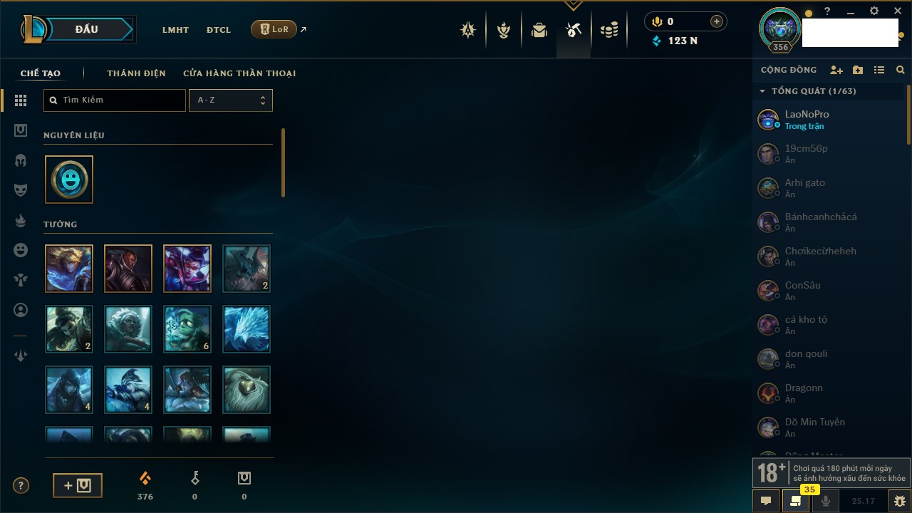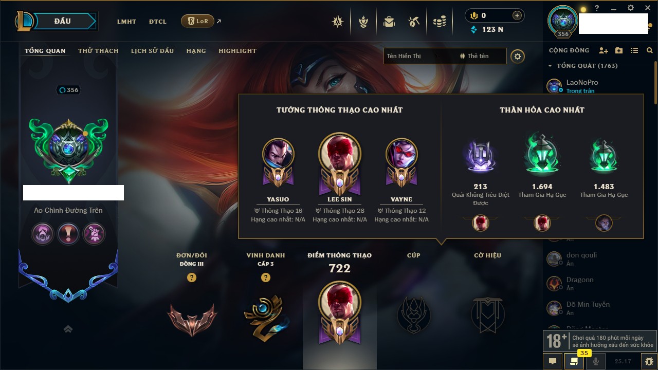 Rank Đơn: Bạch Kim IIKhung: Bạch kimTướng: 171 - Còn 316137 THXTrang Phục: 89Rank ĐTCL: Bạch Kim IIILinh Thú: 94