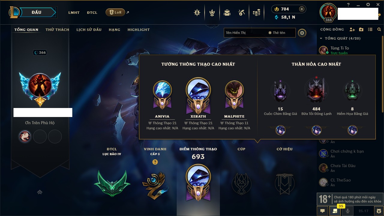 Rank Đơn: Bạch Kim IIKhung: Bạch kimTướng: 171 - Còn 141298 THXTrang Phục: 274Rank ĐTCL: Bạch Kim IILinh Thú: 188