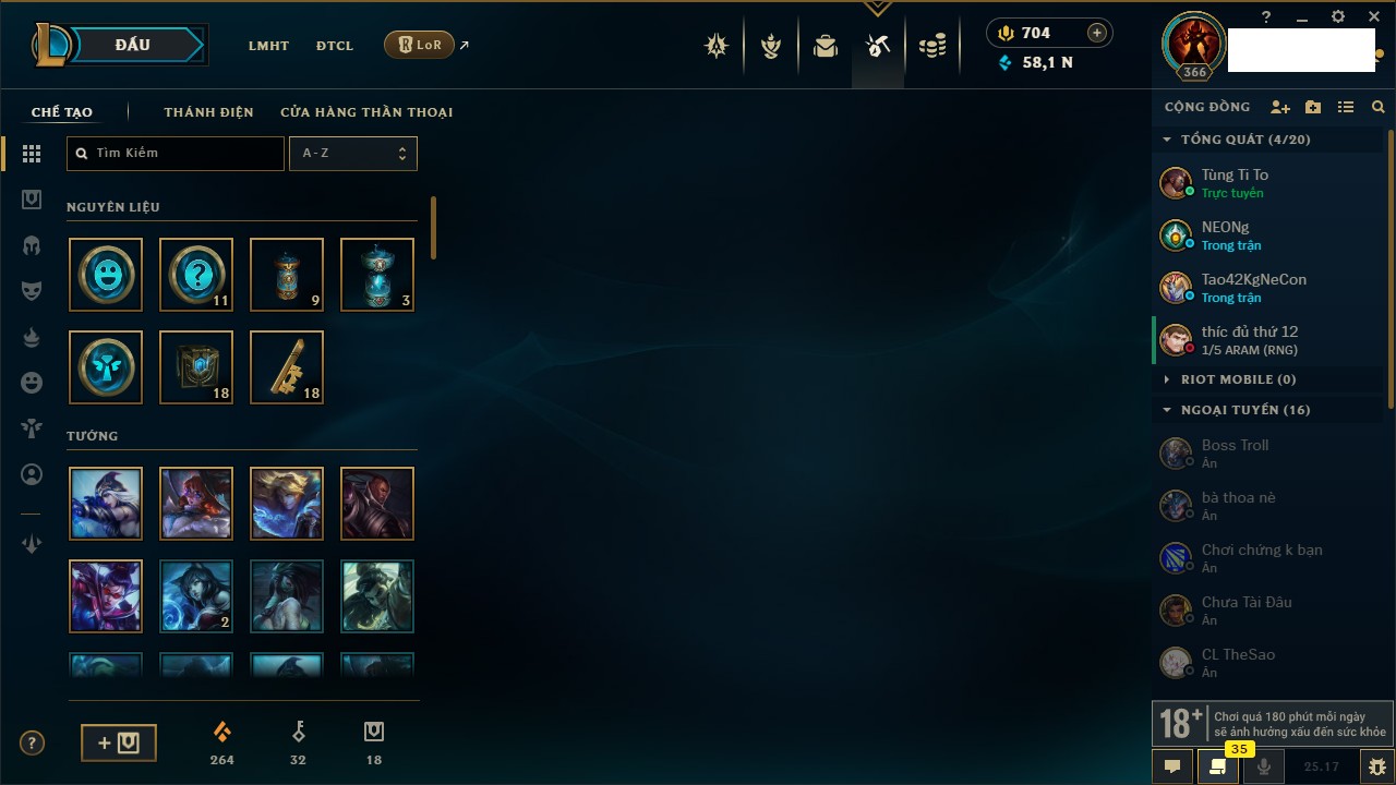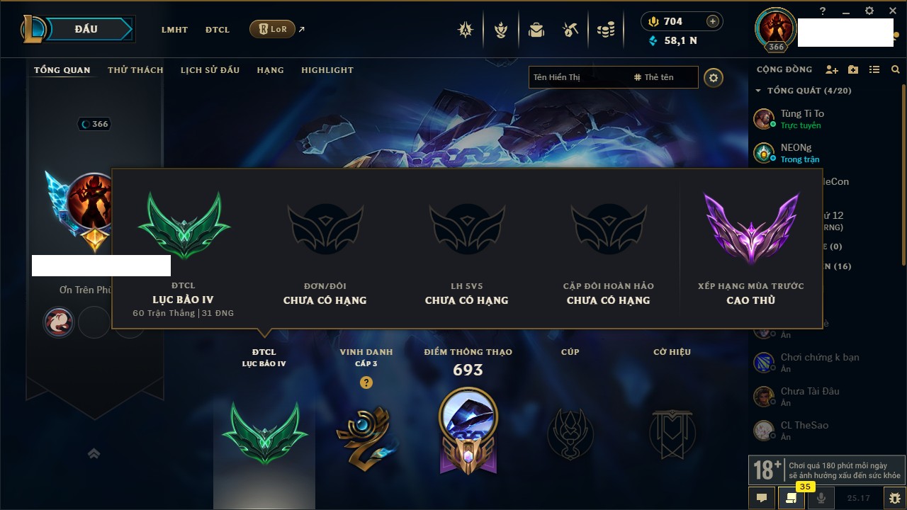 Rank Đơn: Vàng IKhung: BạcTướng: 171 - Còn 60584 THXTrang Phục: 286Rank ĐTCL: Vàng IIILinh Thú: 117