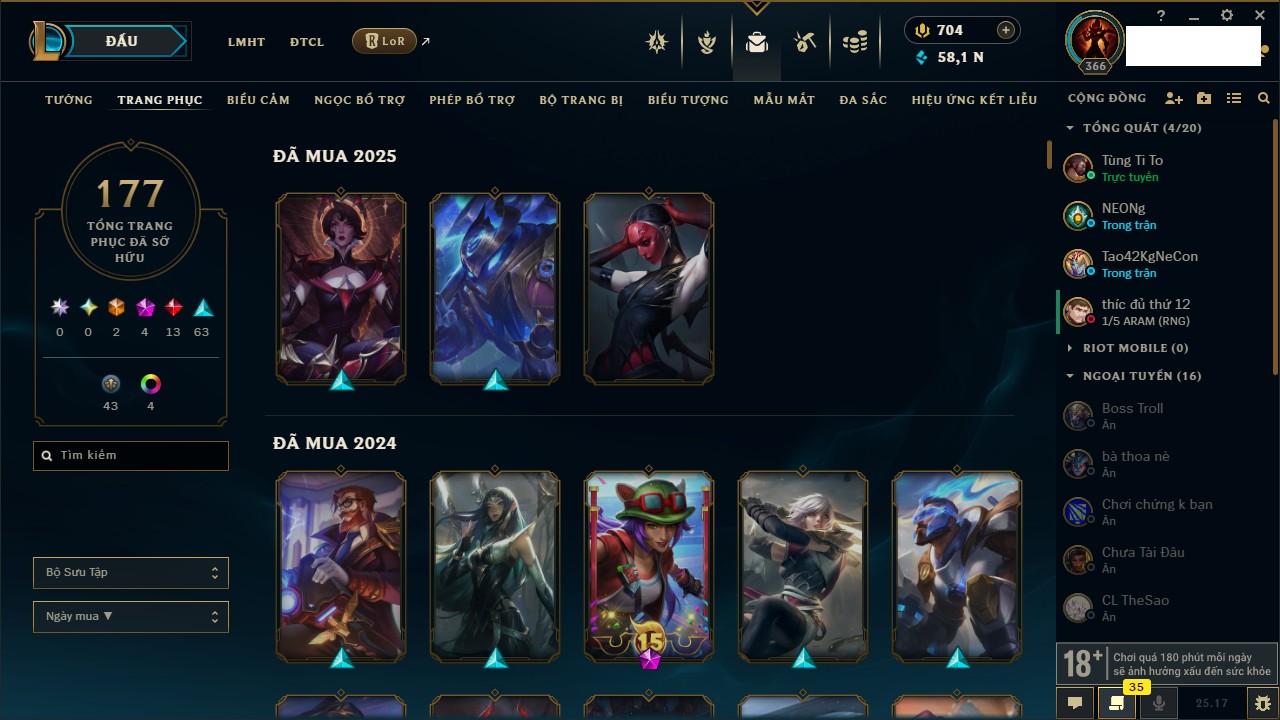 Rank Đơn: Vàng IIIKhung: VàngTướng: 171 - Còn 88128 THXTrang Phục: 329Rank ĐTCL: Chưa RankLinh Thú: 41
