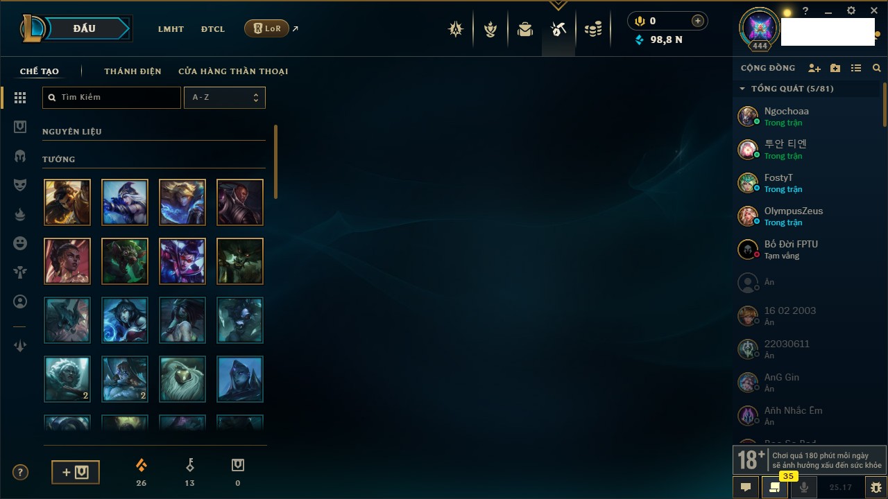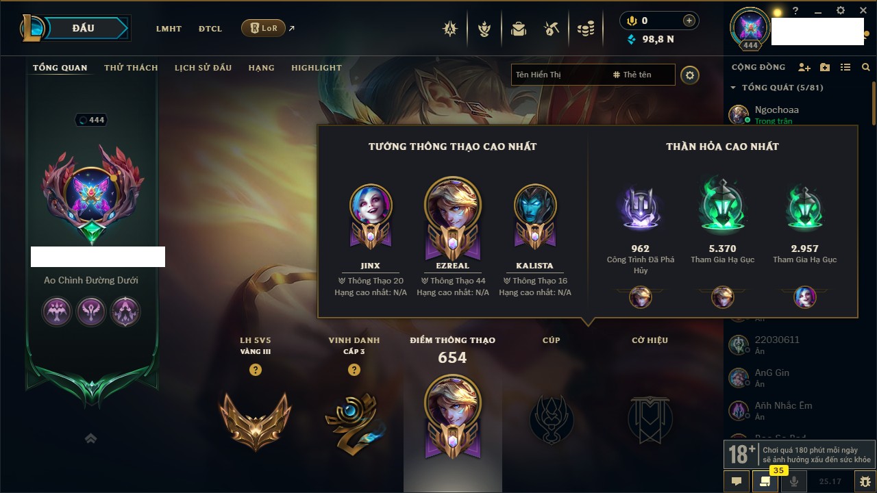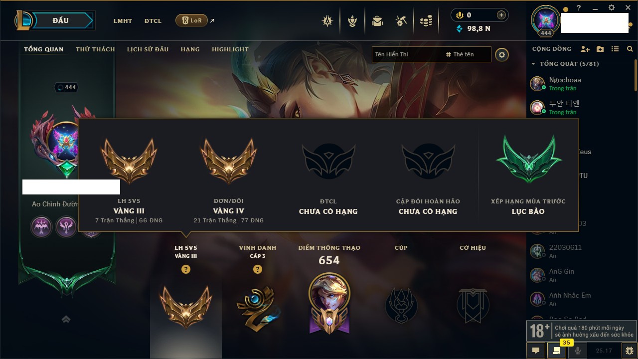 Rank Đơn: Vàng IKhung: BạcTướng: 171 - Còn 60584 THXTrang Phục: 286Rank ĐTCL: Vàng IIILinh Thú: 117