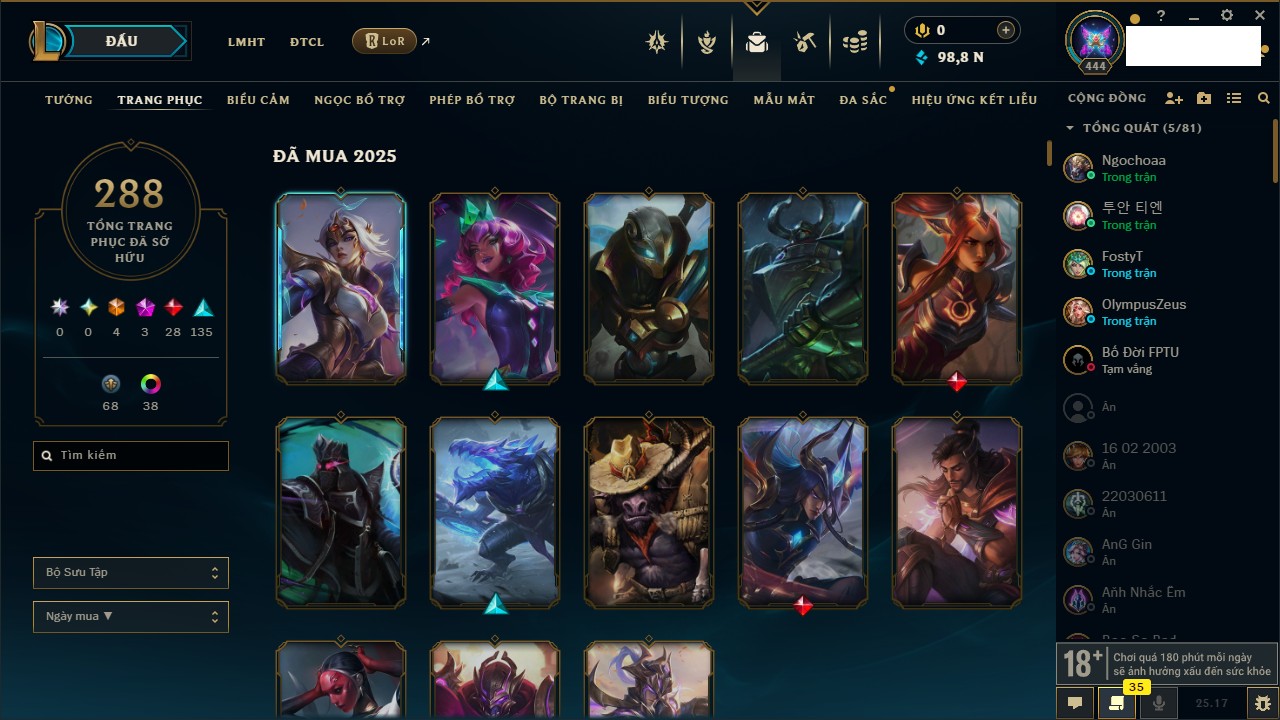 Rank Đơn: Vàng IIIKhung: VàngTướng: 171 - Còn 88128 THXTrang Phục: 329Rank ĐTCL: Chưa RankLinh Thú: 41