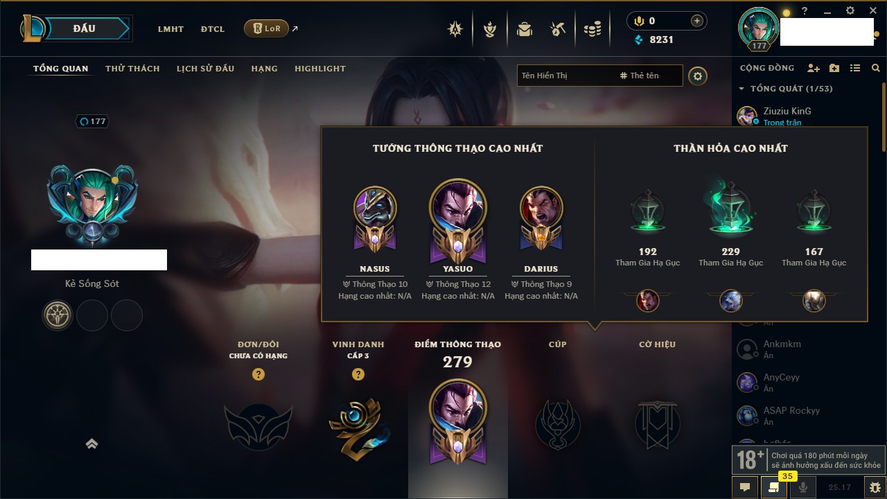 Rank Đơn: Chưa RankKhung: Chưa có khungTướng: 118 - Còn 13712 THXTrang Phục: 117Rank ĐTCL: Chưa RankLinh Thú: 34