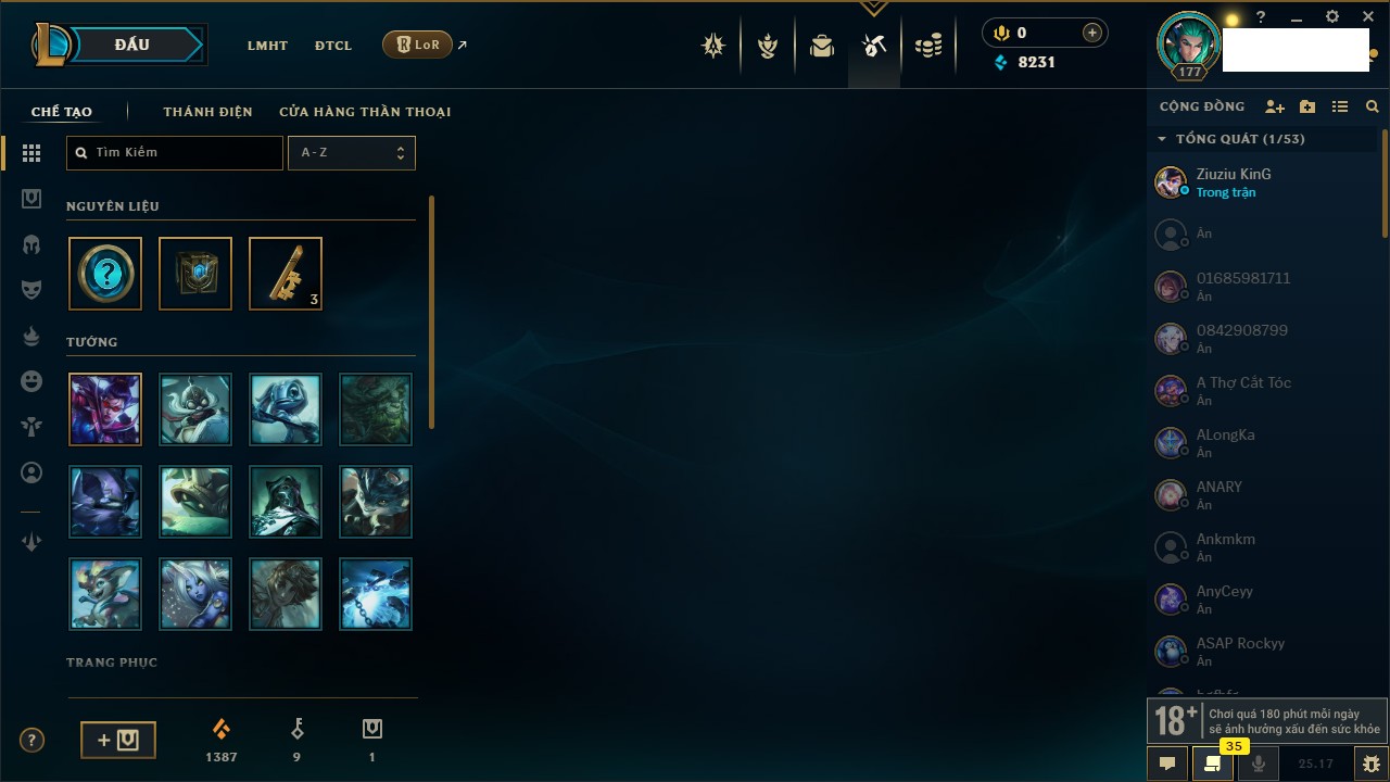 Rank Đơn: Chưa RankKhung: Chưa có khungTướng: 37 - Còn 27387 THXTrang Phục: 10Rank ĐTCL: Chưa RankLinh Thú: 1