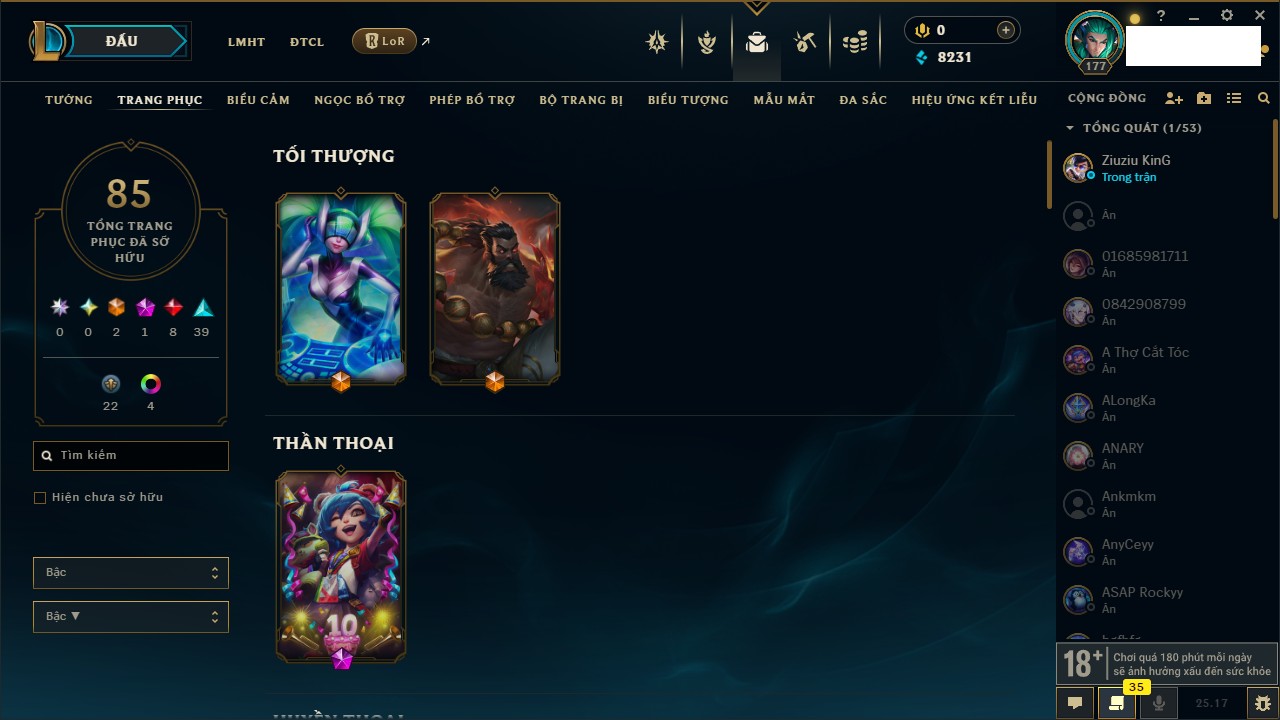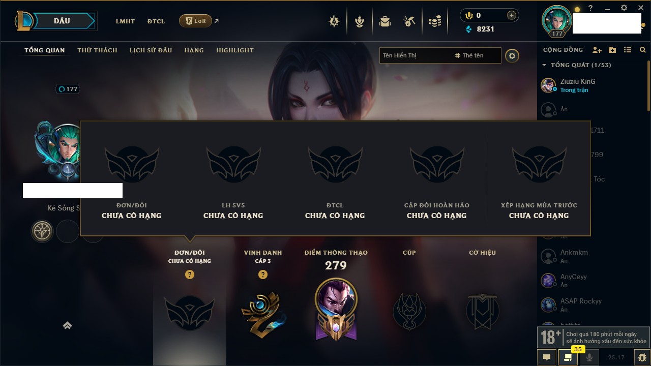 Rank Đơn: Chưa RankKhung: Chưa có khungTướng: 165 - Còn 3214 THXTrang Phục: 160Rank ĐTCL: Chưa RankLinh Thú: 28