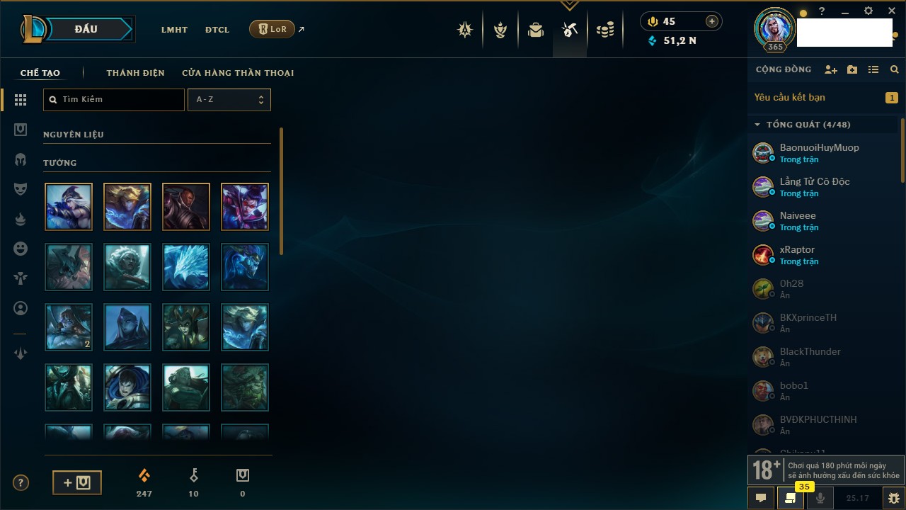 Rank Đơn: Sắt IVKhung: SắtTướng: 171 - Còn 231744 THXTrang Phục: 376Rank ĐTCL: Bạch Kim IILinh Thú: 120